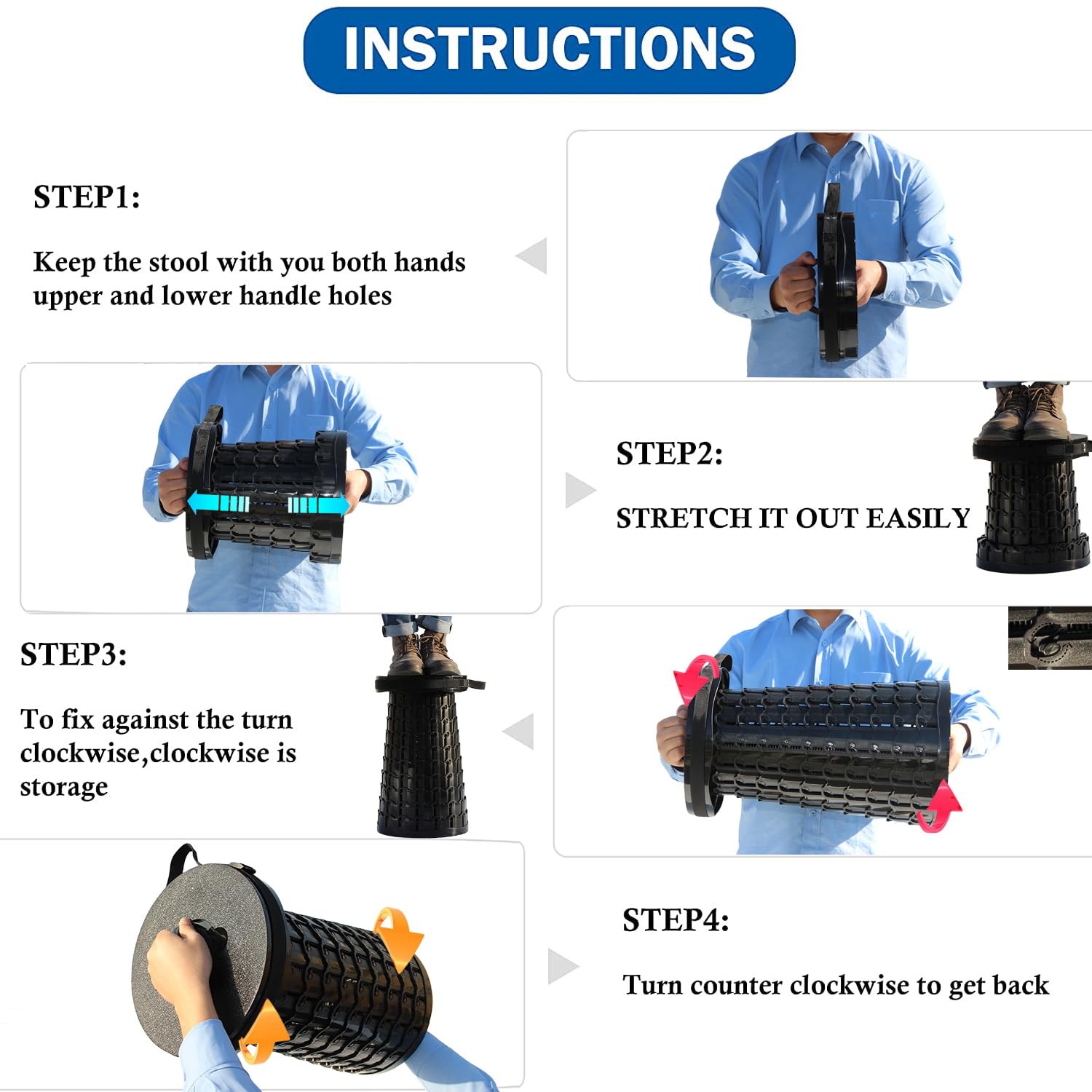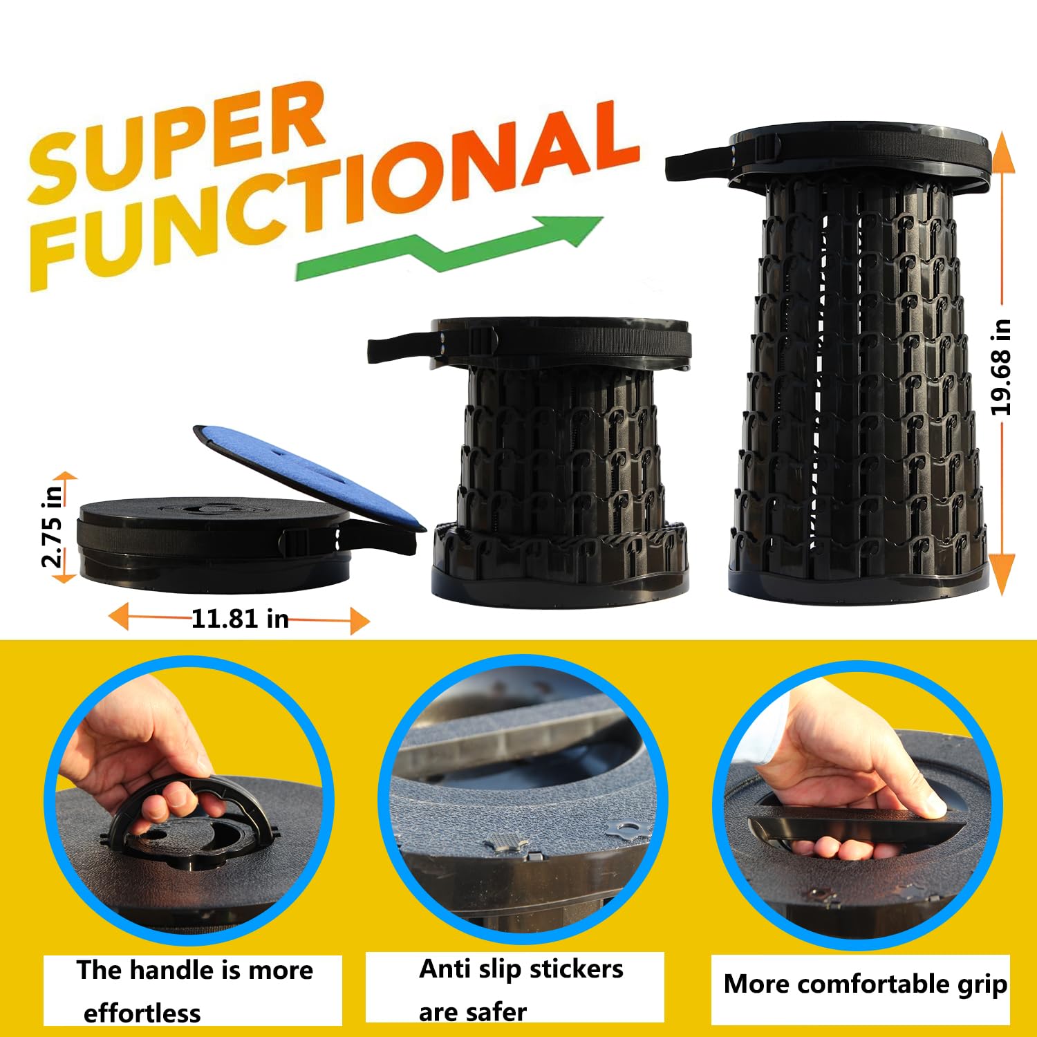 - Taller Collapsible Stools for Adults---Height upgraded from 17.8in to 19.7in. Adjustable range is 2.8in-19.7in.The handle replaces the hole. You only need to grab the handle with two hands and rotate it in the opposite direction to easily open and close in seconds.
