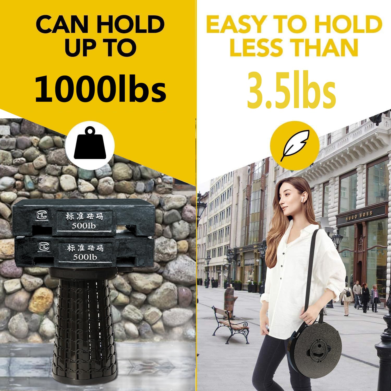 - Bigger Seat&Load Stronger:The weight of the folding stools for adults portable heavy duty is 3.5lbs BUT the load-bearing capacity can reach to 1000lbs.We increased the area of the stool surface and thickened the material.NOW the diameter of the telescoping stool surface is 11.8in. Adjustable strap attached to the sides of the stool so you can carry it in hand or hanging on shoulder without any burden. Folded size( 11.8*11.8*2.75in) does not take up much space.