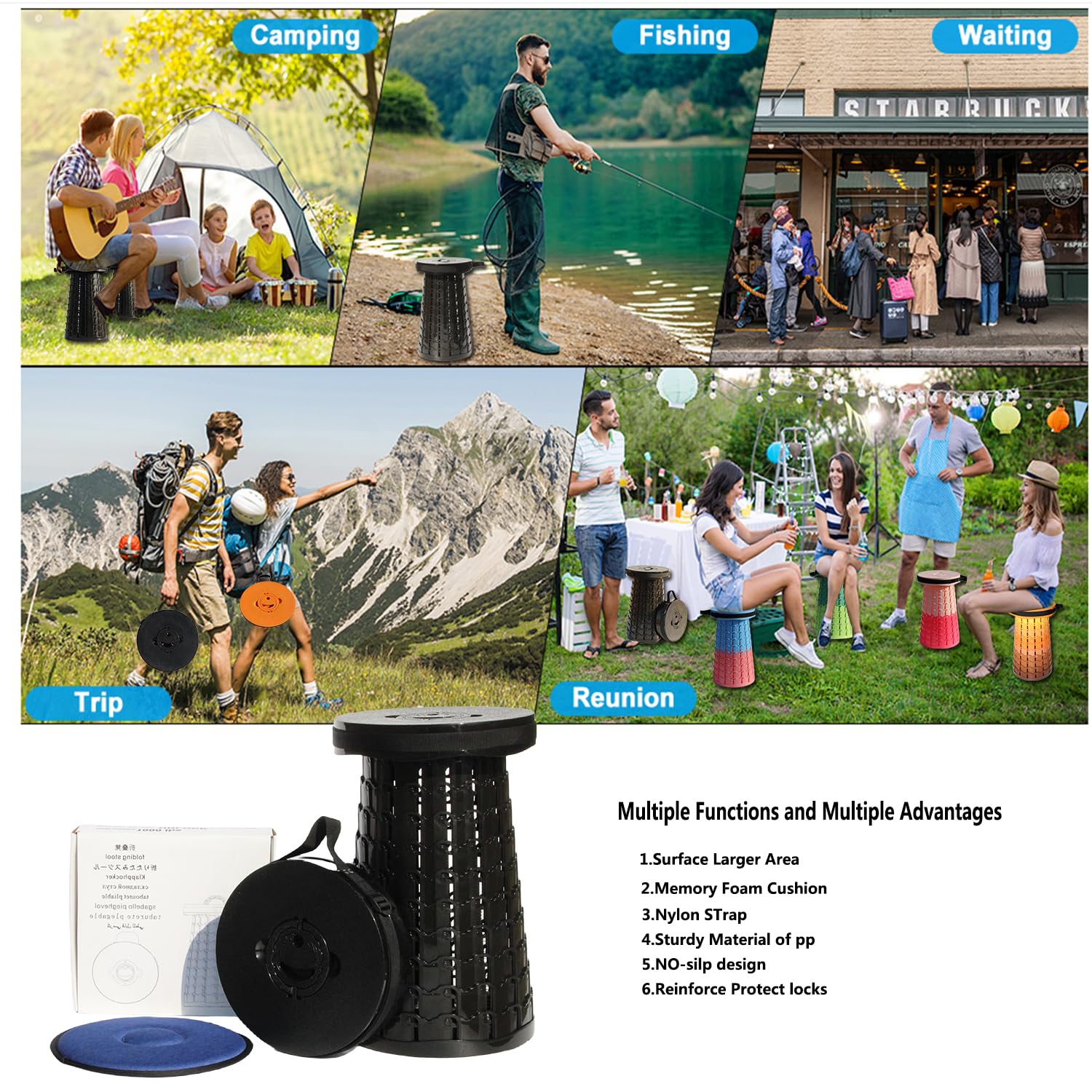 - Widely Application: Camping stool can be used indoors and outdoors, in indoor places such as living rooms, bedrooms, bathrooms, kitchens, and offices. Outdoor activities: garden, hiking, BBQ, camping, queuing, fishing, etc. Perfect gift for friends.