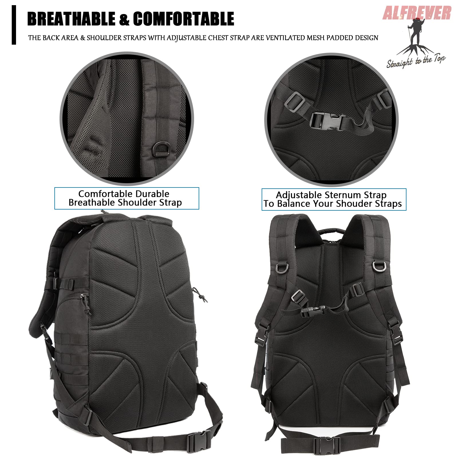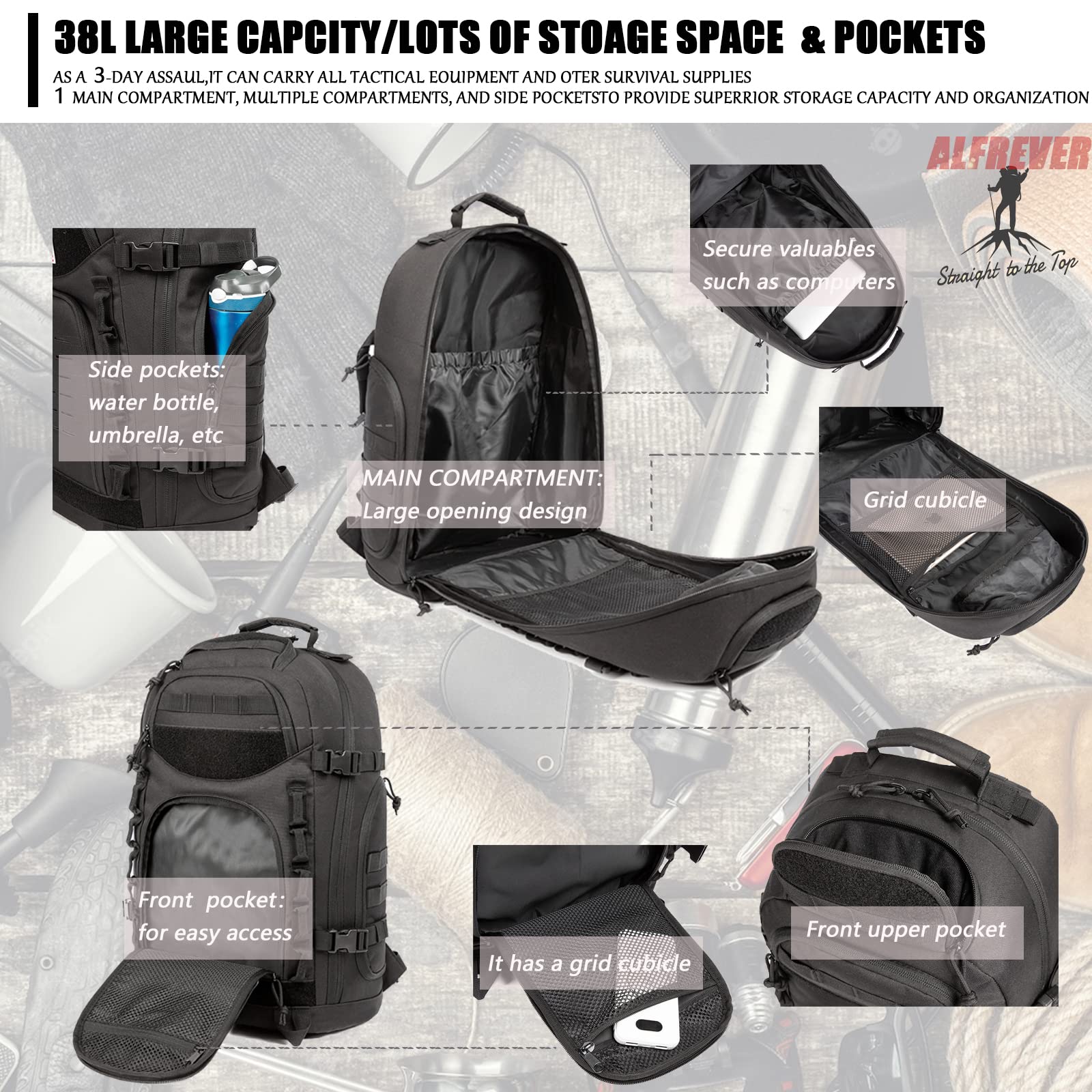 - 38L Large Capacity Backpack: ALFREVER tactical backpack measures 22" x 13.5" x 8", capacity: 38L. Large capacity bag, allowing you to carry all your tactical gear.