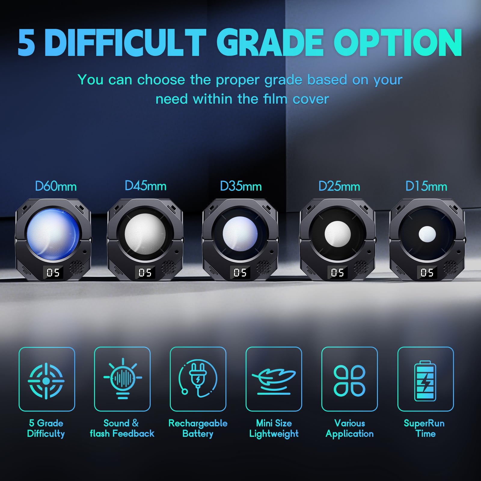 - 5 Grade difficulty: This electronic target provides 5 difficult grade options.(60mm/45mm/35mm/25mm/15mm),highly practive your accuracy skill