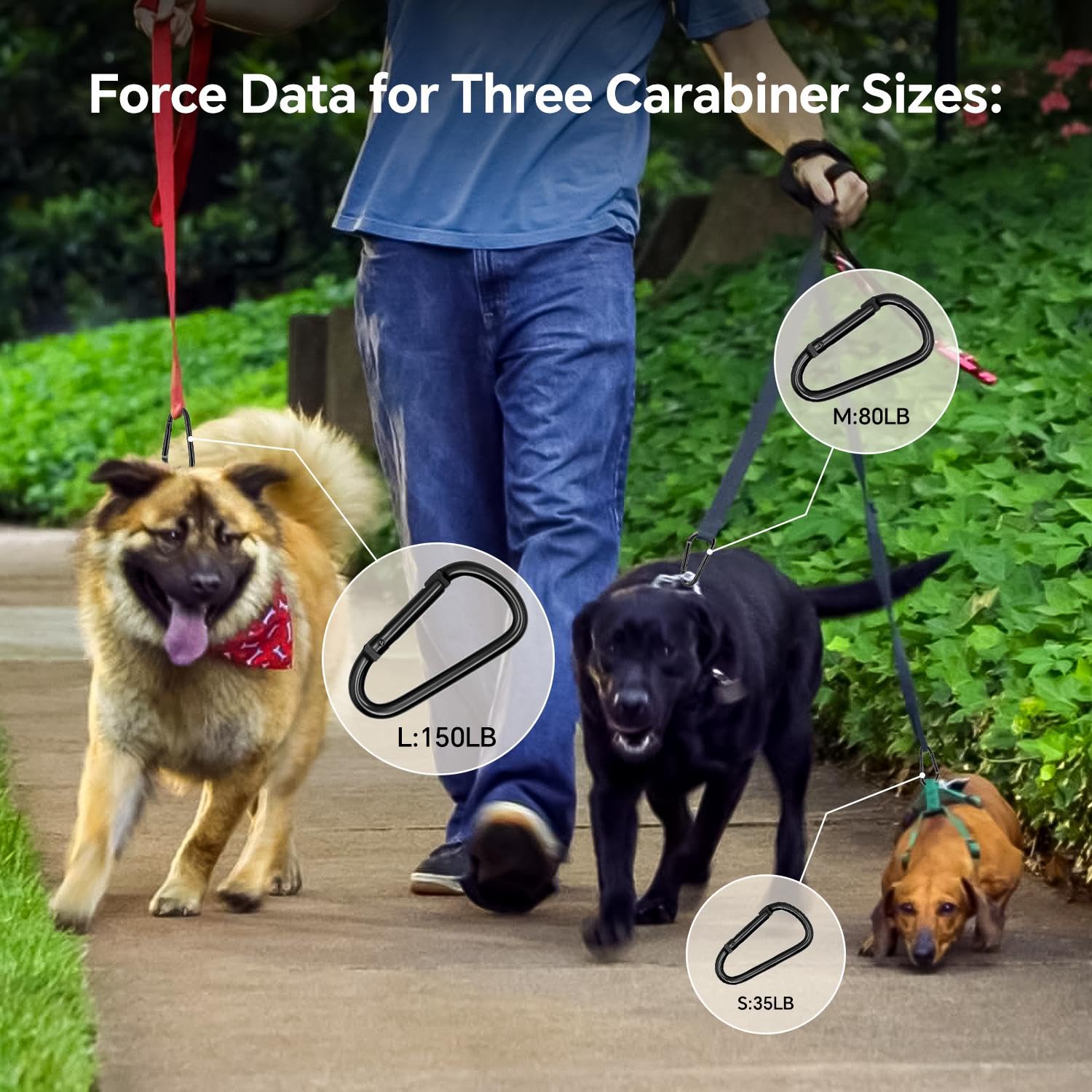 - 12 Pack Black Carabiner Multi Size Pack: Superior quality aluminum carabiner, for keys, pet leash or any other application. The anodizing is very good with bright black colors and a smooth finish. The black finish adds a sleek look. Gate action is smooth and it snaps back quickly
