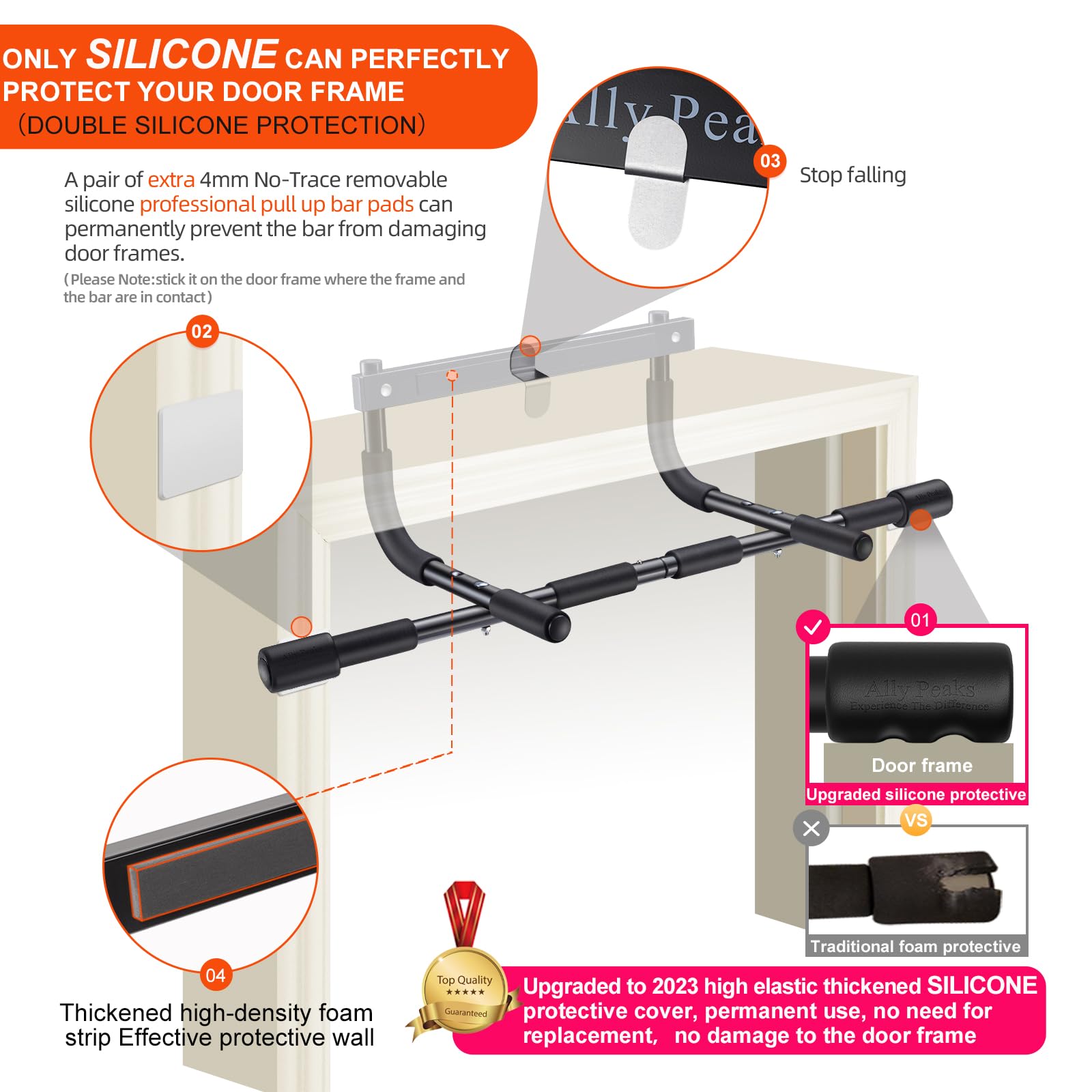 - 💪UPGRADED DOUBLE SILICONE PROTECTION FOR DOOR FRAME:We have upgraded the traditional foam that contacts the door frame to elastic silicone material.Permanent use,better fits and protects door frame without marks.In addition,the chin up bar comes with a pair of extra 4mm No-Trace removable silicone pads .Why do we add protective pads?Because when we do exercise there is an upward and downward force of friction.So double silicone protection(double insurance)for your door frame is the best way.