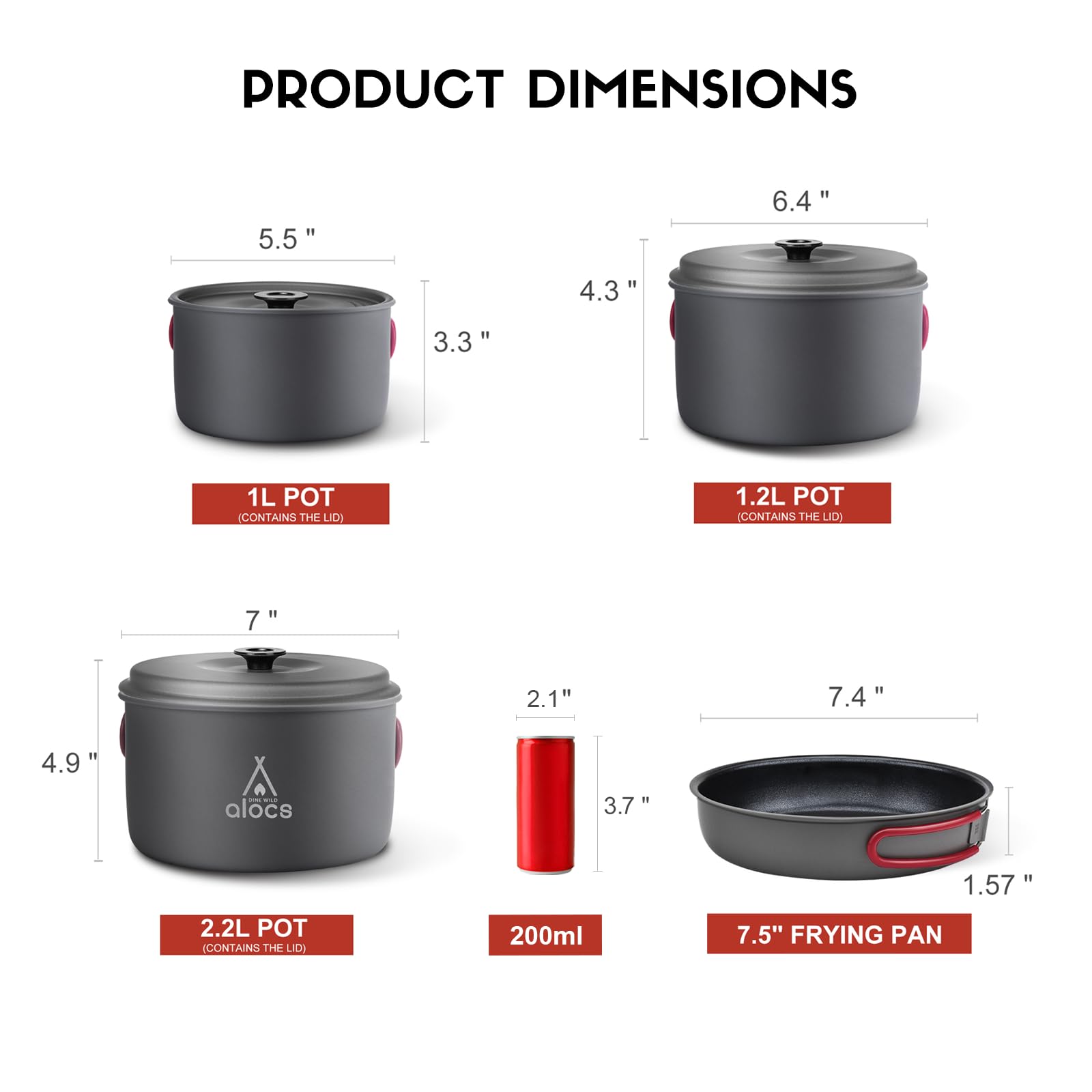 - Lightweight & Portable: The compact camping cooking set is easy to fold and bundle for saving a lot of space of your backpack, making it easy to carry and store. ALocs camping essentials includes 4 camping pot with capacities of 2.2L, 1.2L, 1L, and 7.5"pan, 1.4L kettle. Our camping cookware set can be well placed in a backpack or a travel bag.