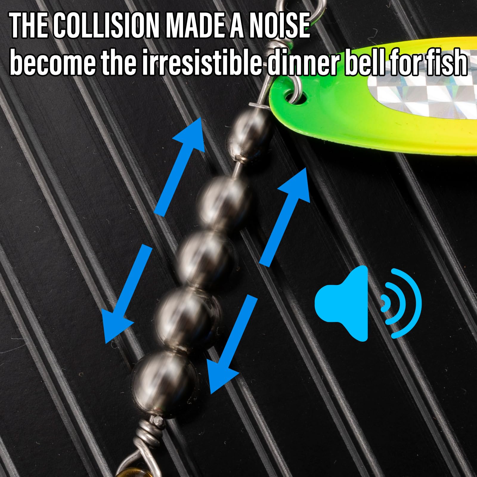 - RINGING EFFECT: Inline shaft is equipped with 5 stainless steel beads of different sizes that can slide. Not only do they collide with each other and make a sound, but they also make a sound when colliding with blade, which will become an irresistible dinner bell for fish.