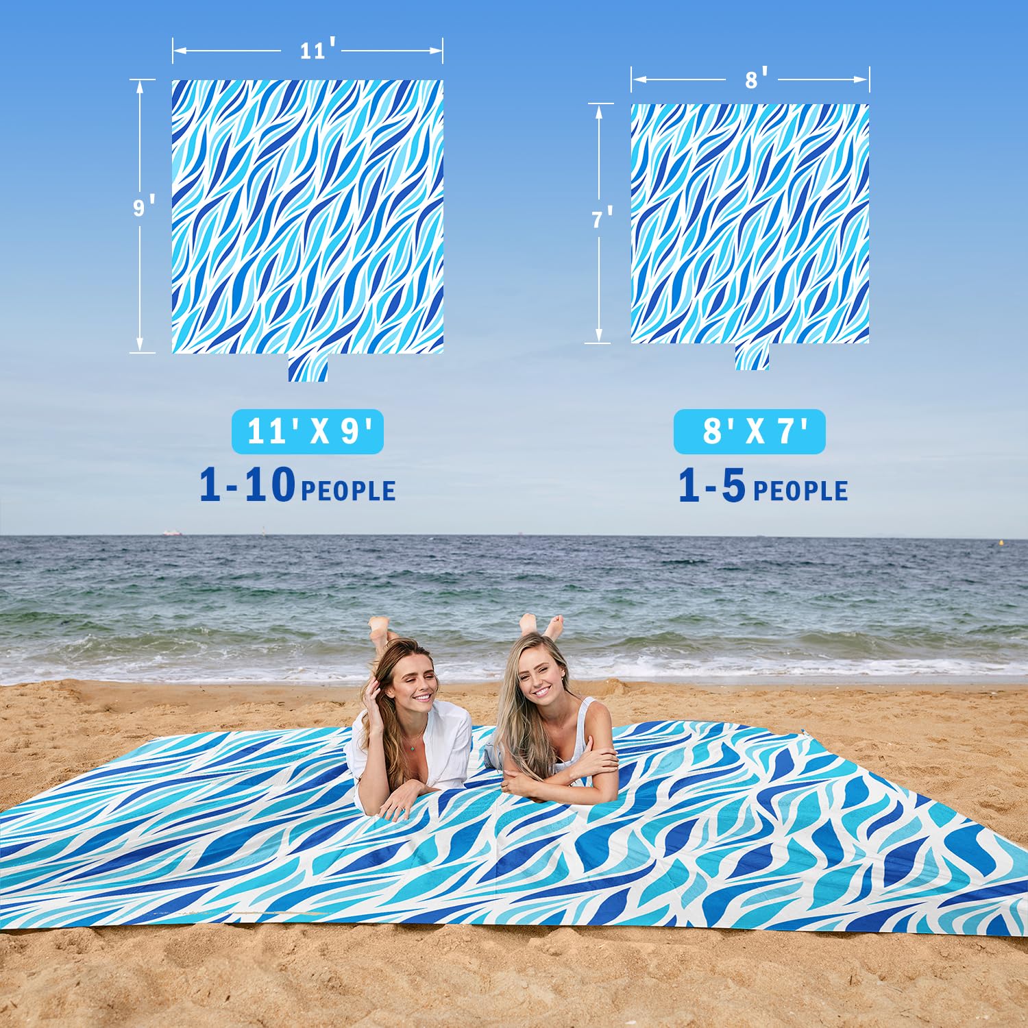 - Extra Large Yet Compact Beach Blanket: This large 11'x9' beach blanket comfortably seats up to 10 people. When not in use, it rolls up into a compact 5"x7" bundle with its attached storage bag.