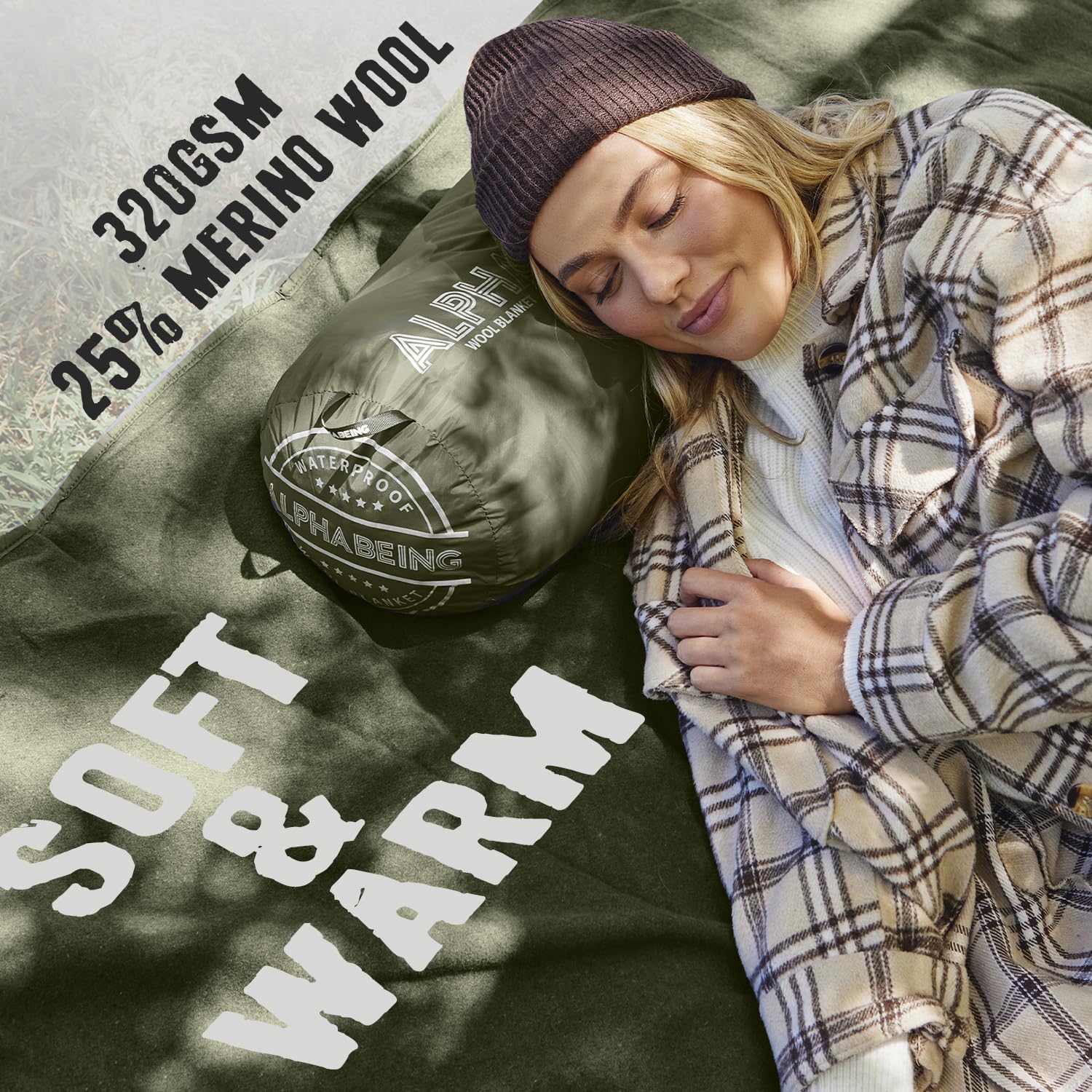 AlphaBeing Waterproof Outdoor Blanket with Merino Wool, Extra Thick Warm, Windproof, Packable Stadium Blankets for Cold Weather, Camping Gift, Pet, Car, Picnic, Concerts, 79" x 59", Olive