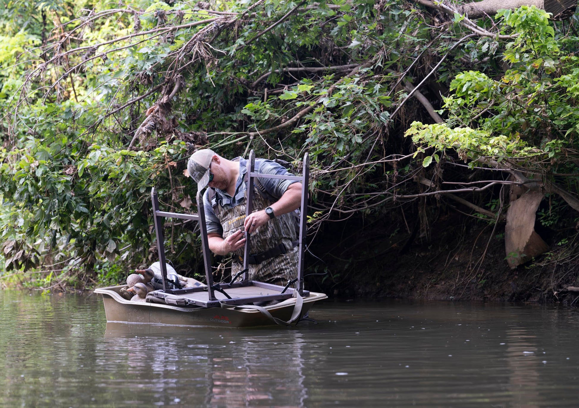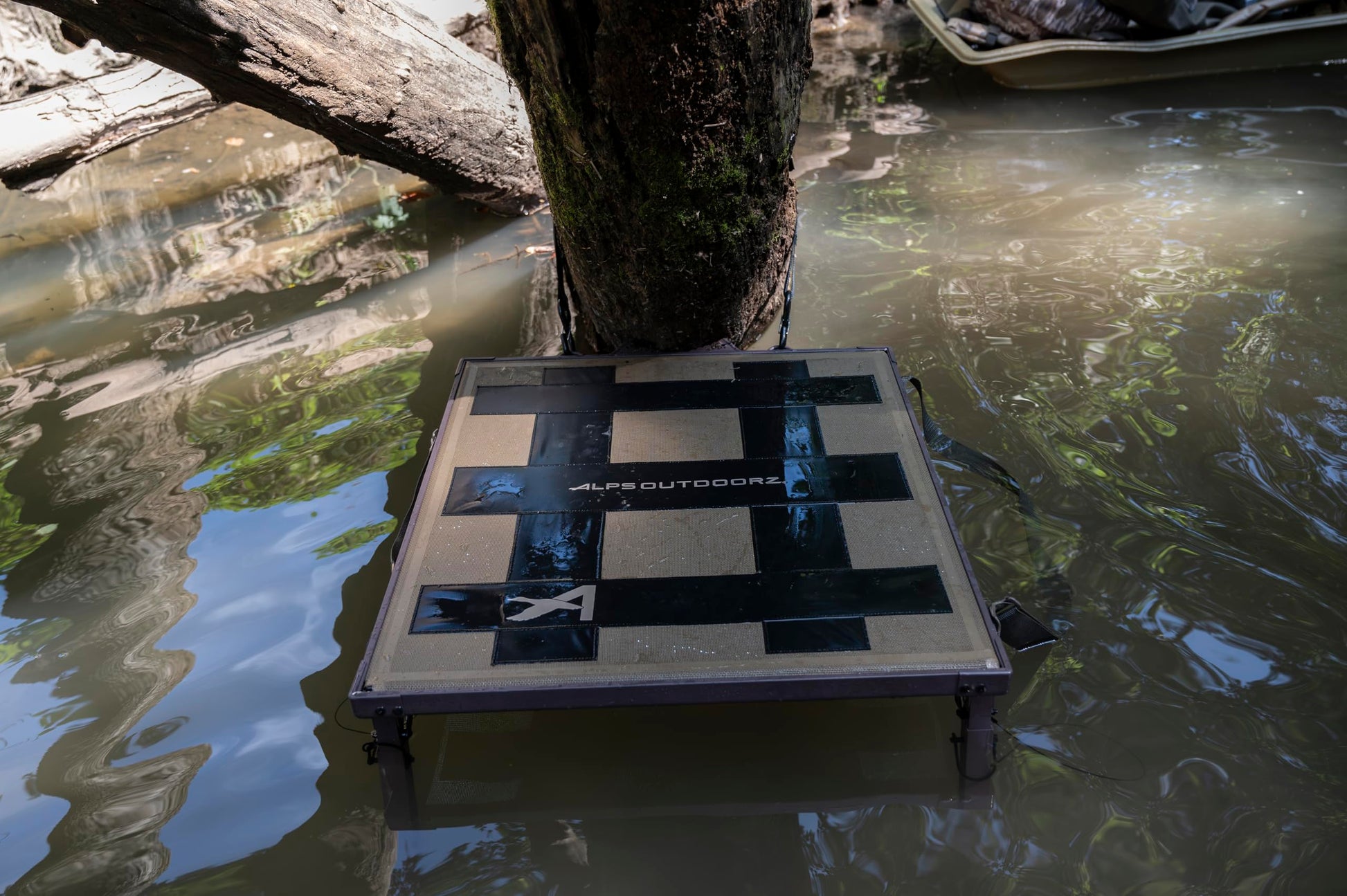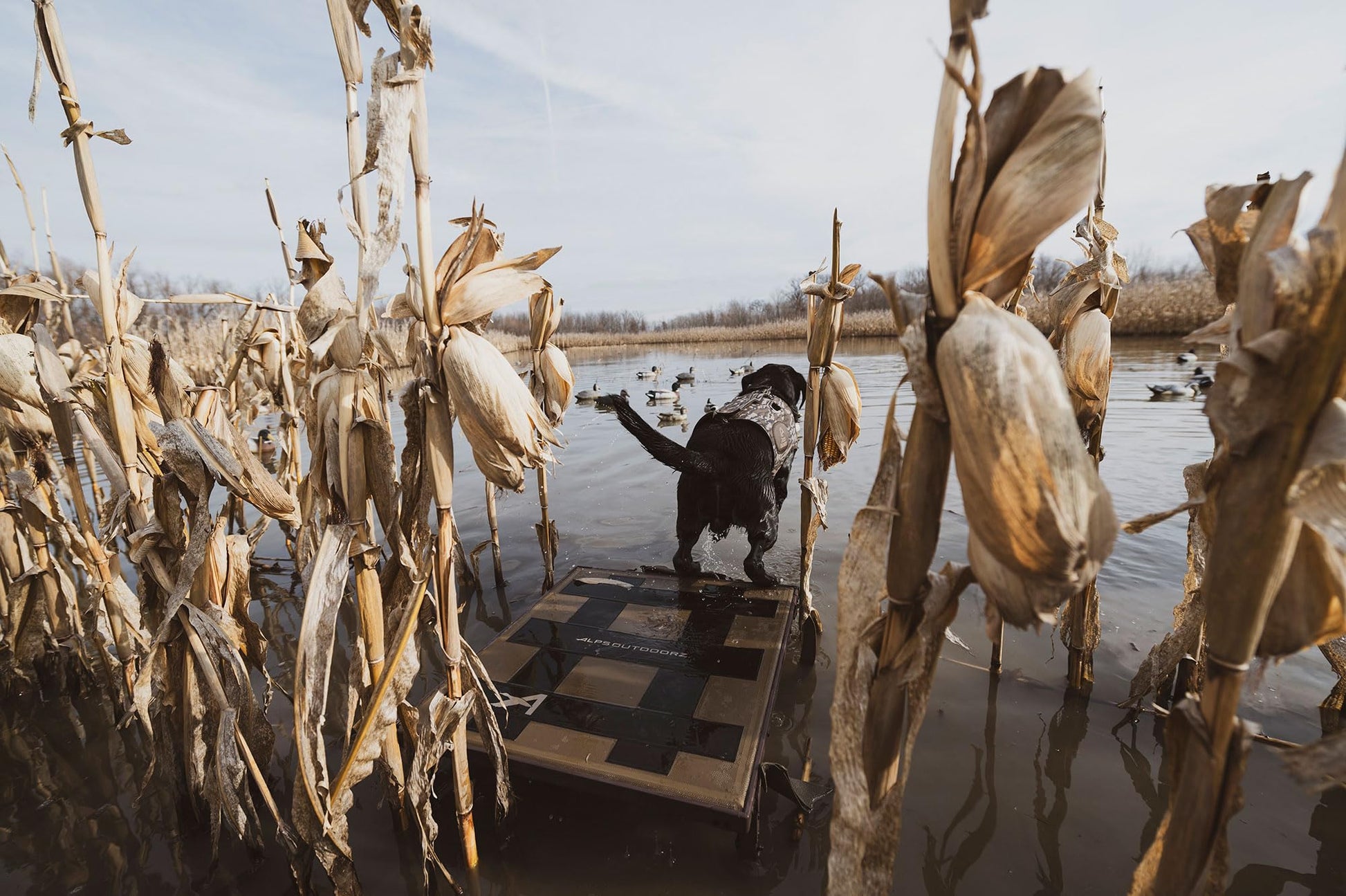 Details: Two dog stands melded into one, the Hybrid Dog Stand is like nothing else on the market. It can mount to a tree in flooded timber in over 30” of water, or be used in dry or flooded fields for hunting or training. The integrated Hypalon platform addresses a pestering issue with all dog stands, the lack of traction when wet. This anti-slip and nearly indestructible material promises to give your dog the ability to remain sure-footed when launching off or mounting on the Hybrid Dog Stand in wet or frosty conditions. Below the Hypalon is our durable TechMesh material that allows water to drain off your dog. Dogs seem to find a way to catch themselves on anything pointy or rough-edged, so we have designed and included a durable and convenient safety cap for the tree cleats for whenever the situation calls. For the most versatile dog stand on the market, we went for overkill with a robust 4 tree cleats welded together, heavy duty welded on D-rings, and a 137” ratchet strap with gated clips that can be secured around a 42” diameter or 130” circumference tree. One of the biggest issues with timber dog stands is their lack of stability. Strap the Hybrid Dog Stand to a tree and shove the front legs into the ground for rock solid stability and maximize your dog’s safety.