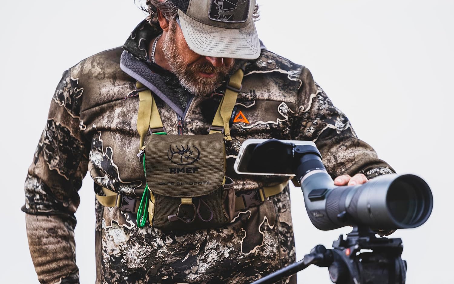 Whether you're tired of having your binoculars swinging from your neck while out in the field or if you're simply wanting to offer your optics protection from the elements, the new rmef licensed ridge stalker x by ALPS Outdoorz is the perfect solution. Designed with the on-the-move hunter in mind, the ridge stalker x uses an adjustable harness and front pocket system to keep your optics close to your chest. No more holding your binoculars against you when bending over or crossing a fence, the optics pocket stays close against your body and eliminates any and all movement. A unique u-shaped design makes removing binoculars quick and easy when you need them and a simple clasp system keeps the pocket securely closed for when you don't. The fleece-lined pocket and built-in lens cloth help to keep your optics protected and clean. In addition to the main optics pocket, the ridge stalker x features a side pocket perfect for wind indicator and external lashing points for attaching extra gear. 1680D nylon ballistic fabric make the ridge stalker x extremely durable. If you're looking for a hands-free way to haul your optical gear the ridge stalker x is the perfect binocular accessory.