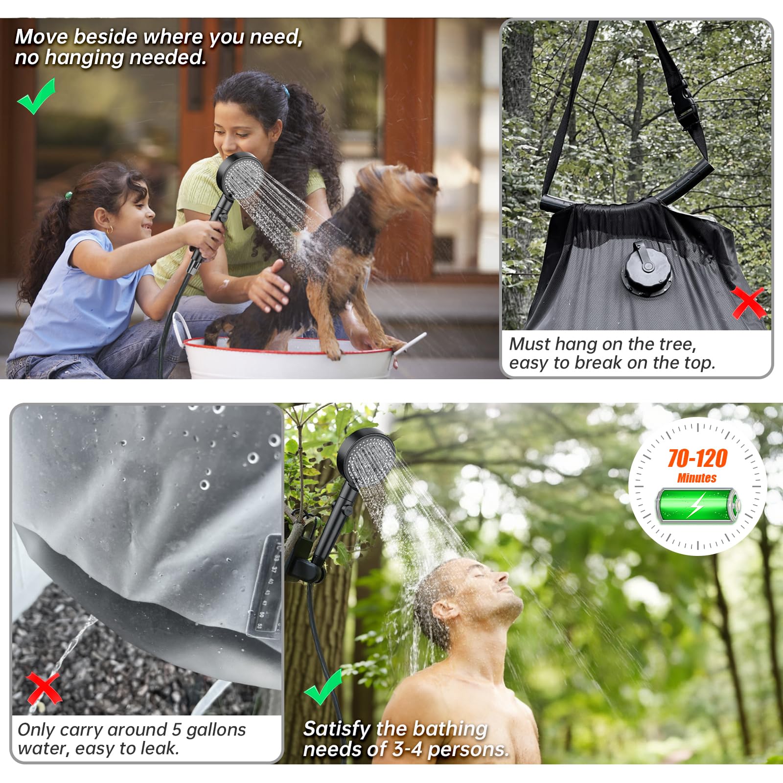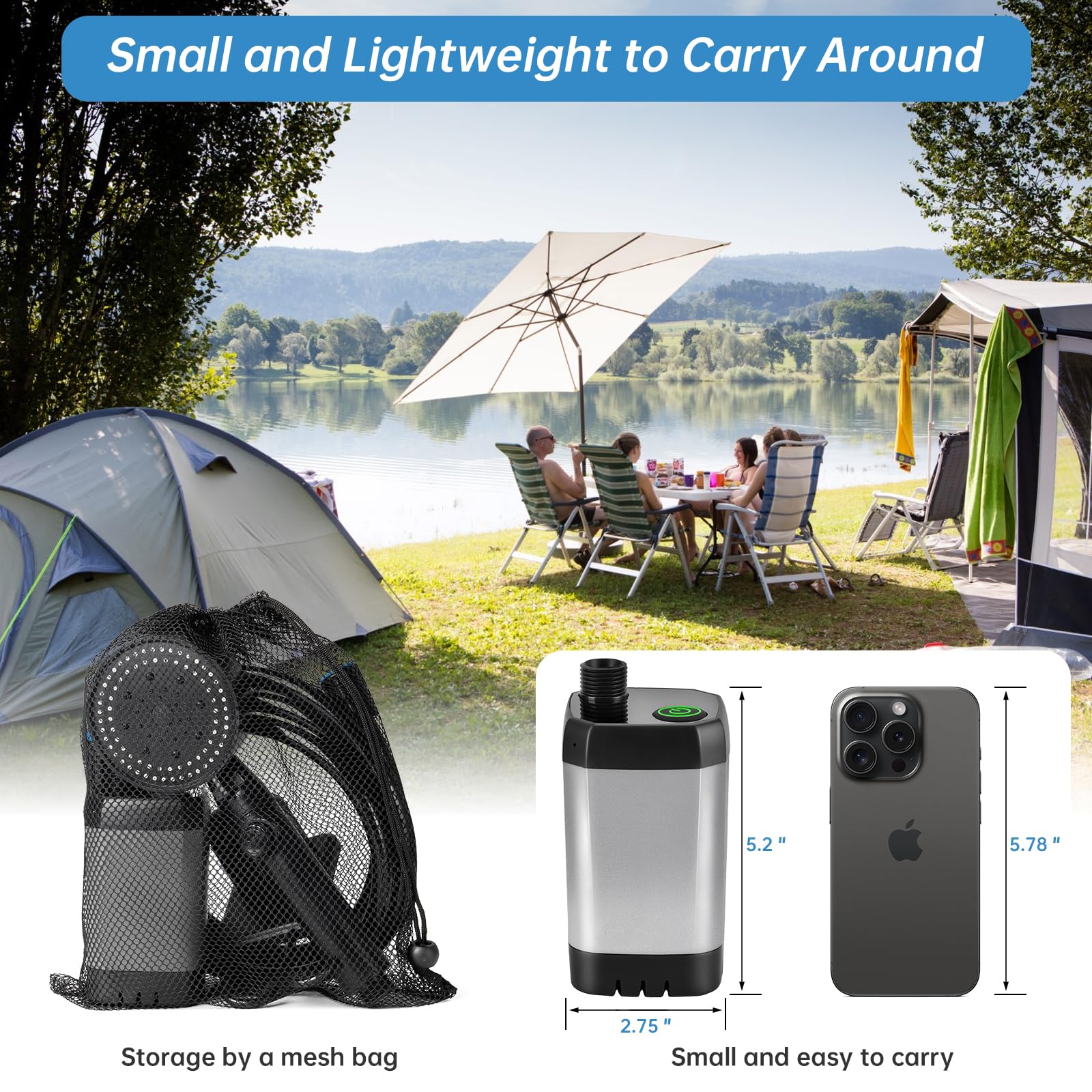 - š š²š²šš š¢šš²šæ šÆ š£š²šæšš¼š» š¦šµš¼šš²šæš¶š»š“: This portable shower has built-in 6000mAh lithium battery, which provides up to 120 minutes of battery life for showing. Satisfying about 3-4 person showering under fully charged. You can charge it through your phone charger, laptop's USB output or car's USB output