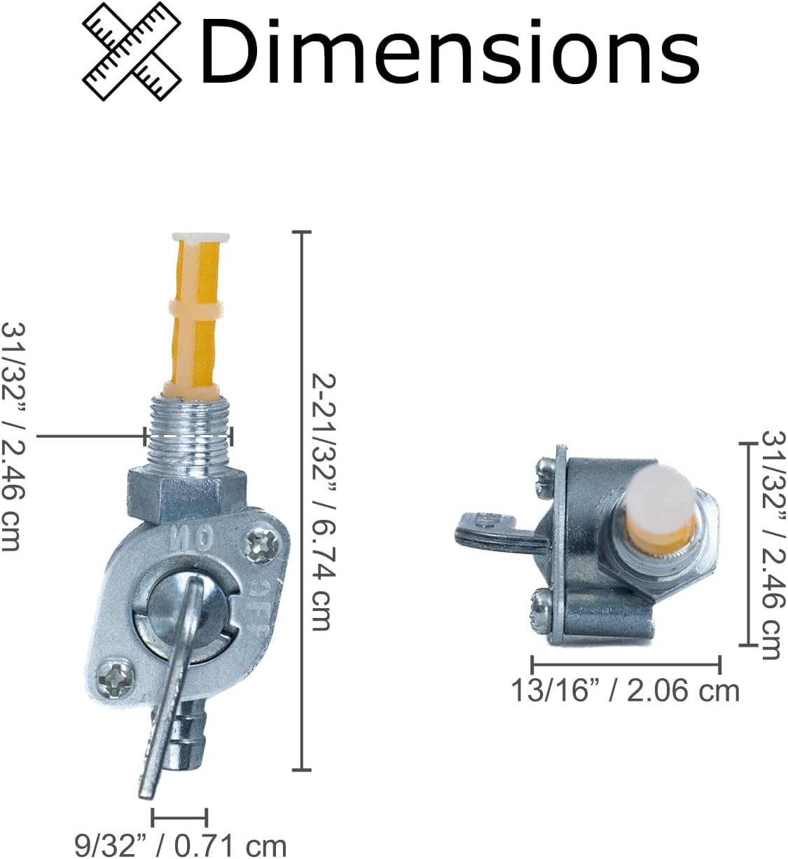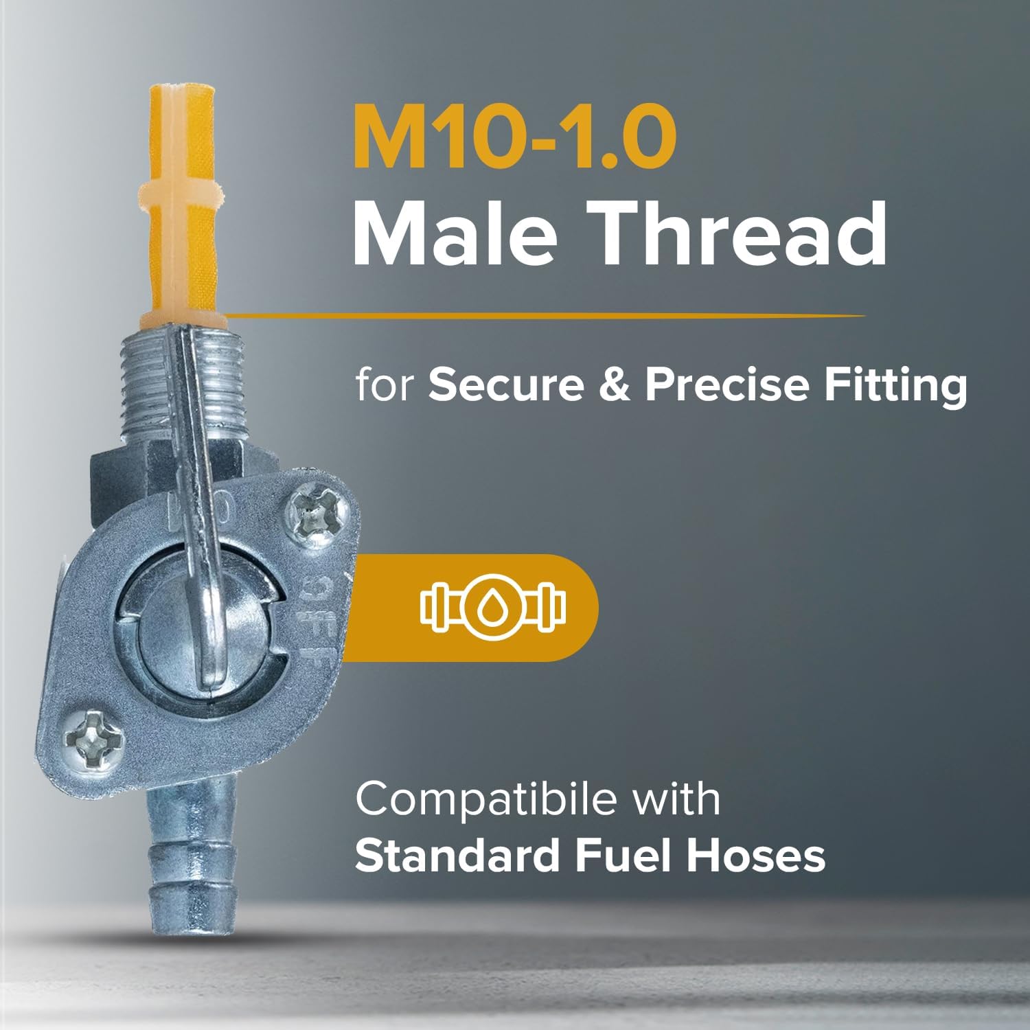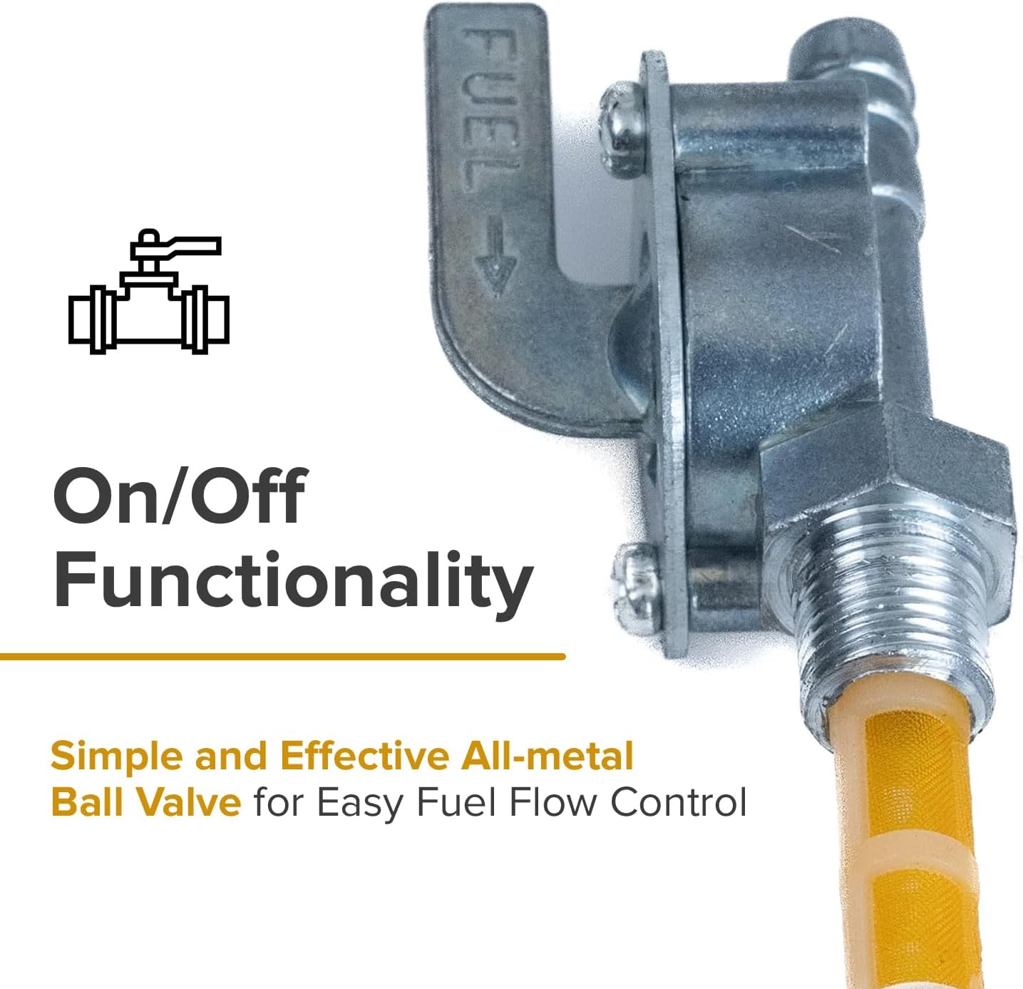 This little On/Off all-metal ball valve is used with 3/16" (5 mm) internal diameter fuel hose, and connects to the fuel tank by way of an M10-1.0 thread. There is also a filter screen to keep the dirt, rust flecks, and other fuel tank crud from getting up into your carb.