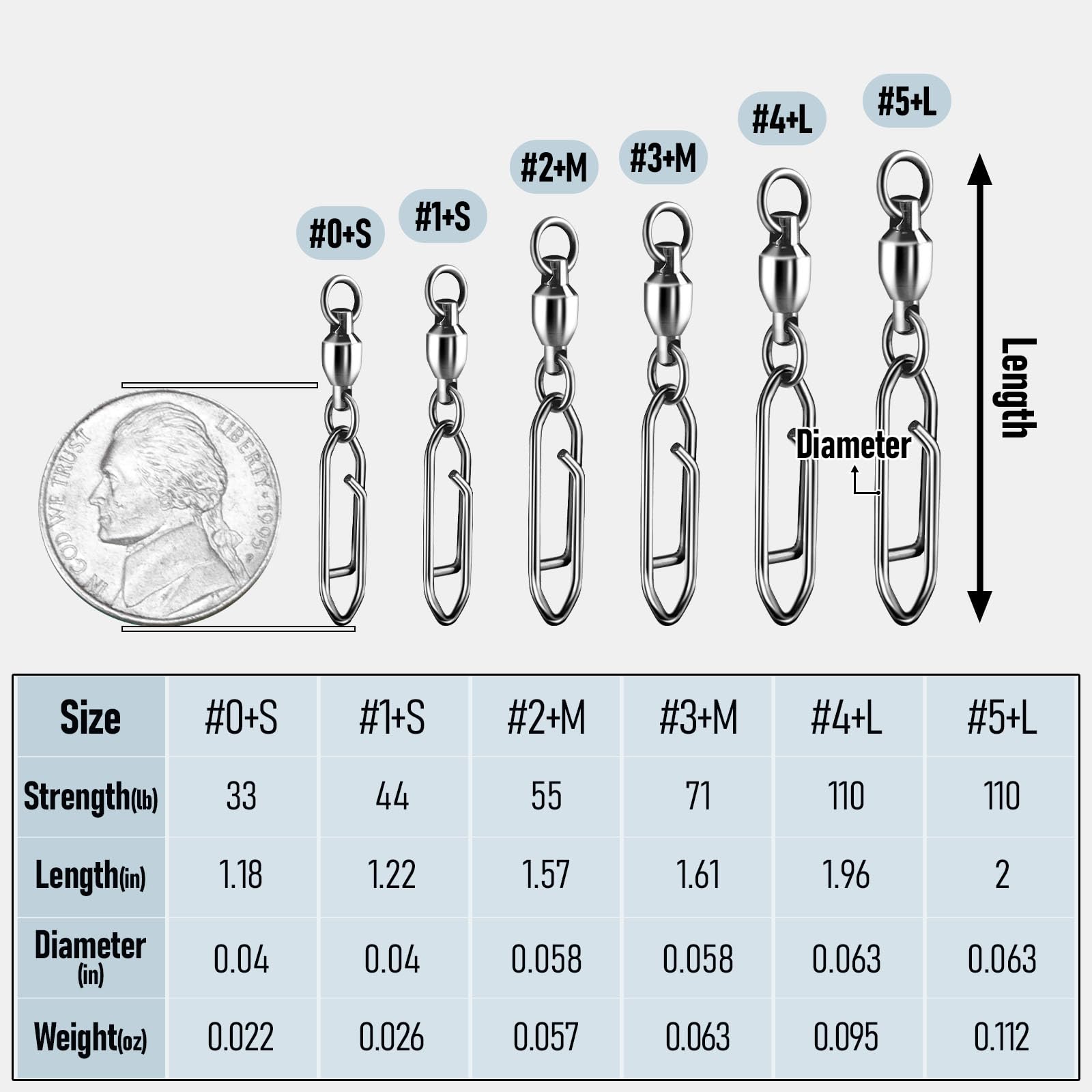 - SMOOTH & PRACTICAL: The finely polished surface ensures no damage to line. It is worth mentioning that you can detach the snap swivel easily and use it as fishing quick clip and ball bearing swivel respectively according to your actual needs.