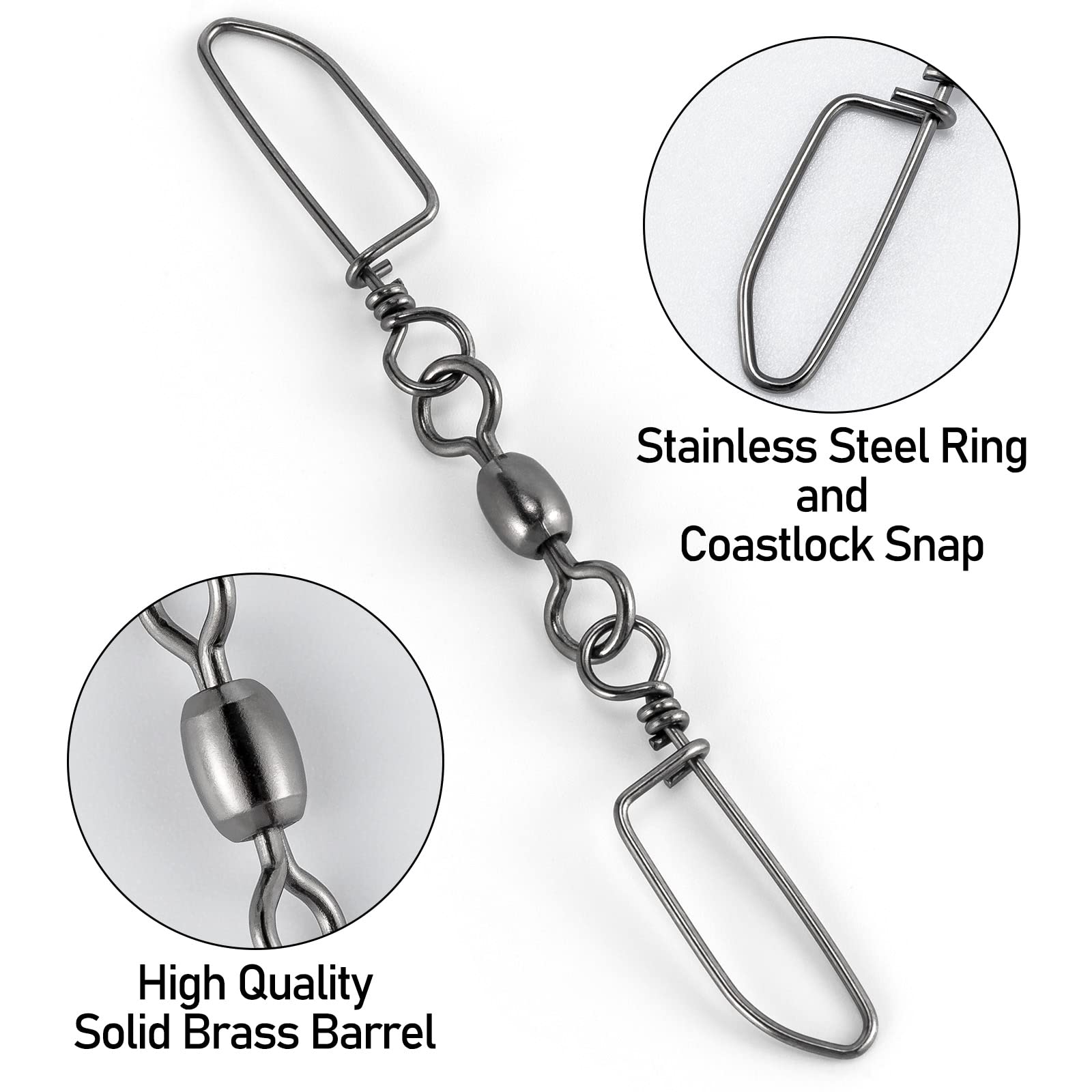 - PREMIUM MATERIALS. High quality brass barrel swivel body. Solid stainless steel ring and coastlock snap. The whole snap swivel is coated with black nickel.