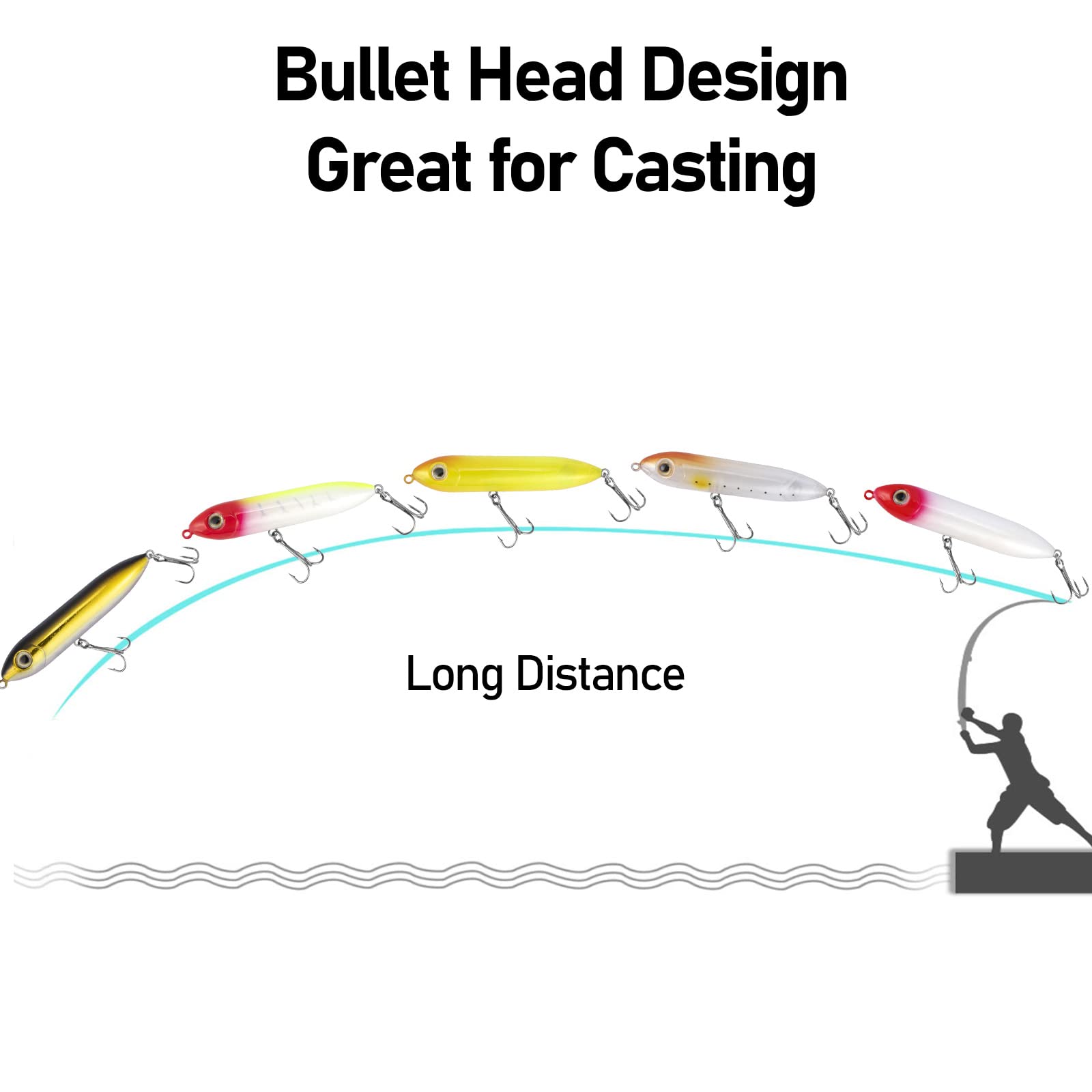 - LONG CASTING DISTANCE. Bullet head design reduces air resistance and built-in rolling steel ball precisely increases the weight of the topwater fishing lure, making it easy to achieve the desired projection distance.