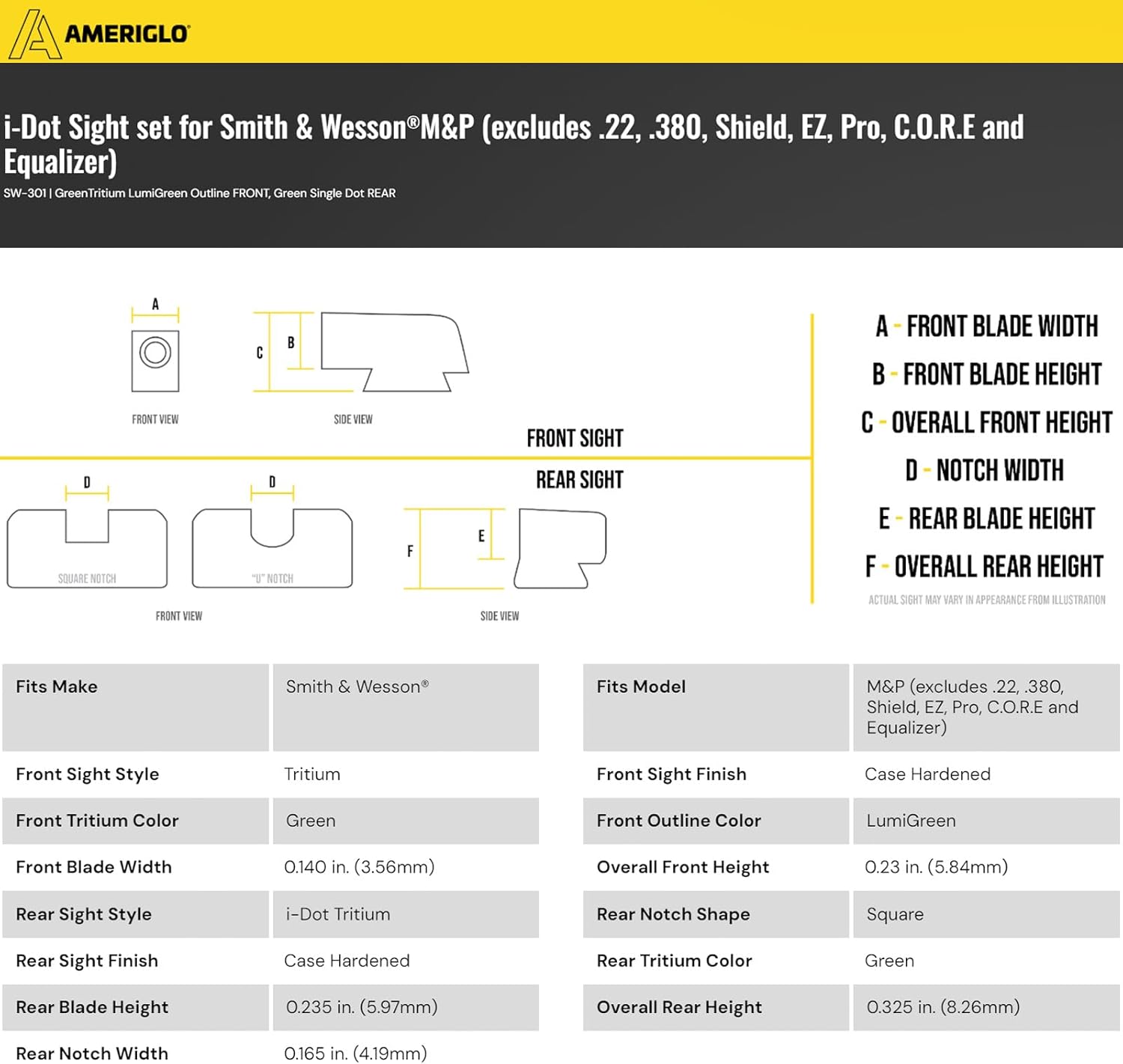 AMERIGLO i-Dot Night Sight Set for Smith & Wesson M&P – Front & Rear Green Tritium Lamps