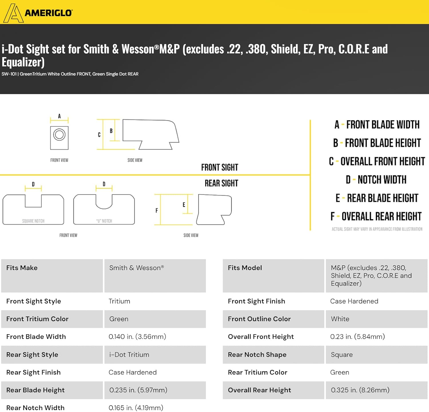 AMERIGLO i-Dot Sight Set, Compatible with Smith & Wesson M&P (Excludes .22, 380, Shield, EZ, Pro, C.O.R.E and Equalizer) | Front & Rear Night Sights with Green Tritium Lamps