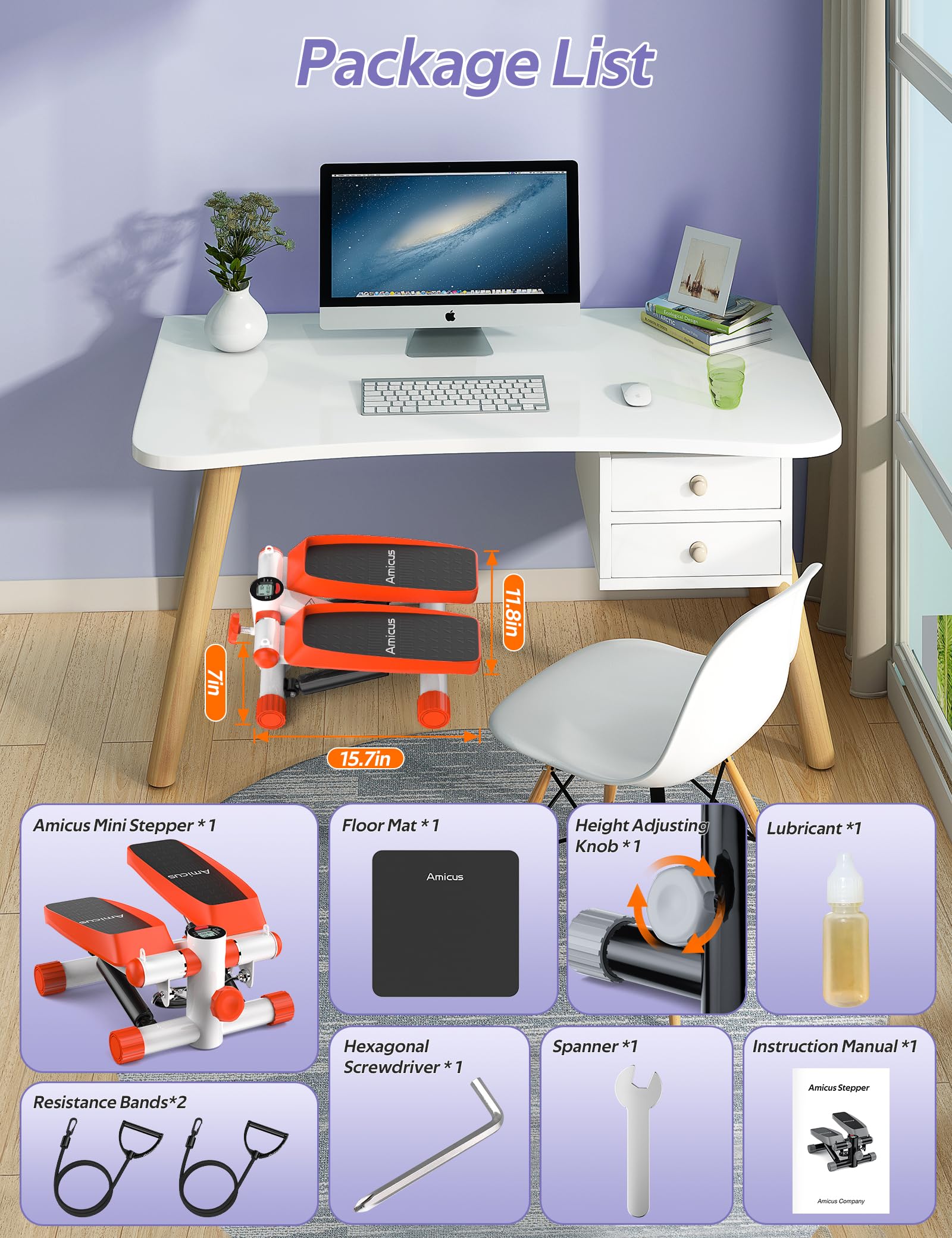 - 【Package Listing】 Amicus Mini Stepper * 1, Resistance Bands * 2, Floor Mat * 1, Height Adjusting Knob * 1, Lubricant * 1, Hexagonal Screwdriver * 1, Spanner * 1, Instruction Manual * 1