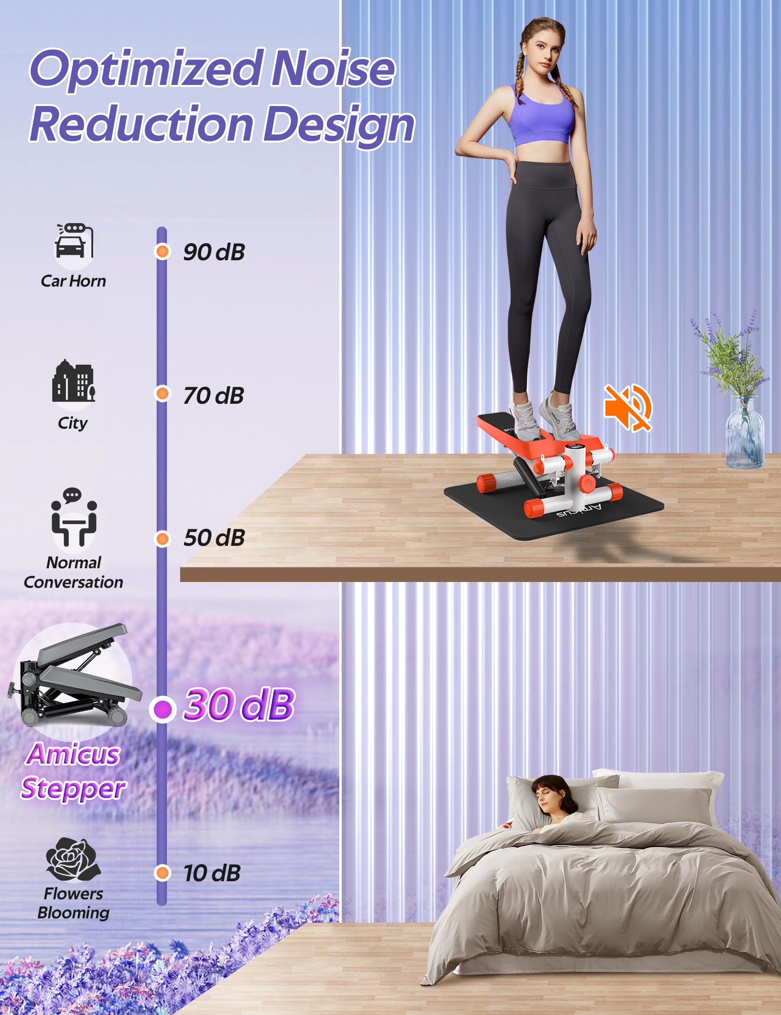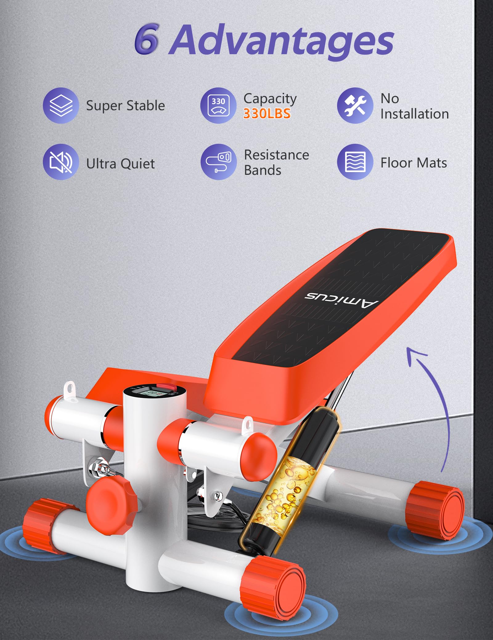 - 【Resistance Bands & Floor Mat】The durable resistance bands that enable you to engage your upper body muscles while stepping. This comprehensive workout targets multiple muscle groups for a full-body sculpting effect. The bottom of the stepper adds anti slip and protective silicone, which can enhance the anti slip effect while protecting the floor. On some wooden floors, we suggest that you use the felt mat equipped with Amicus to prevent the wooden floor from being left with indentation.