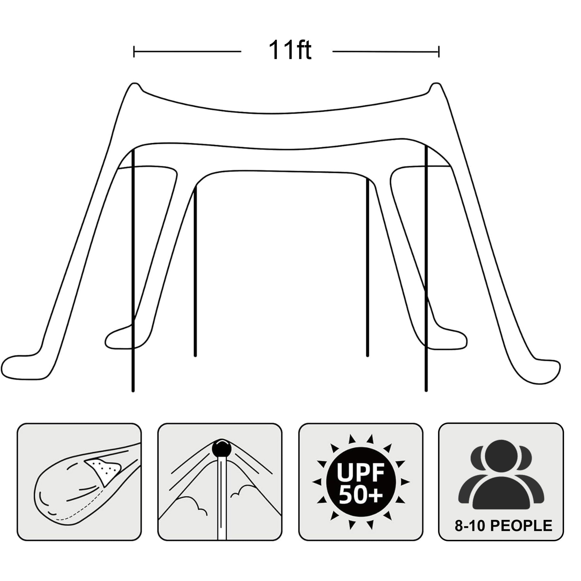 - Versatile XL Family Beach Shelter: The AMMSUN Beach Pop-Up Shade Tent spans 11 feet in width and length, delivering generous protection, ideal for group gatherings and family bonding, enabling carefree seaside enjoyment with your cherished companions