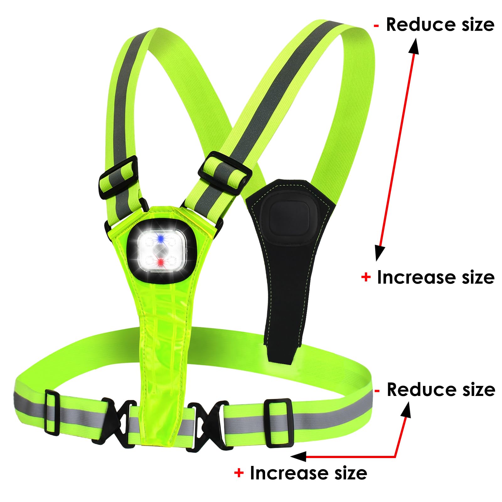 - 2 warning lights and 3 lighting modes: the chest light can illuminate the moving obstacles, the rear indicator light warns the approaching vehicle to help the driver see the runner and avoid accidents, the running vest has three lighting modes: high brightness, low brightness and flash. You can change the lighting mode by pressing the button as you like.