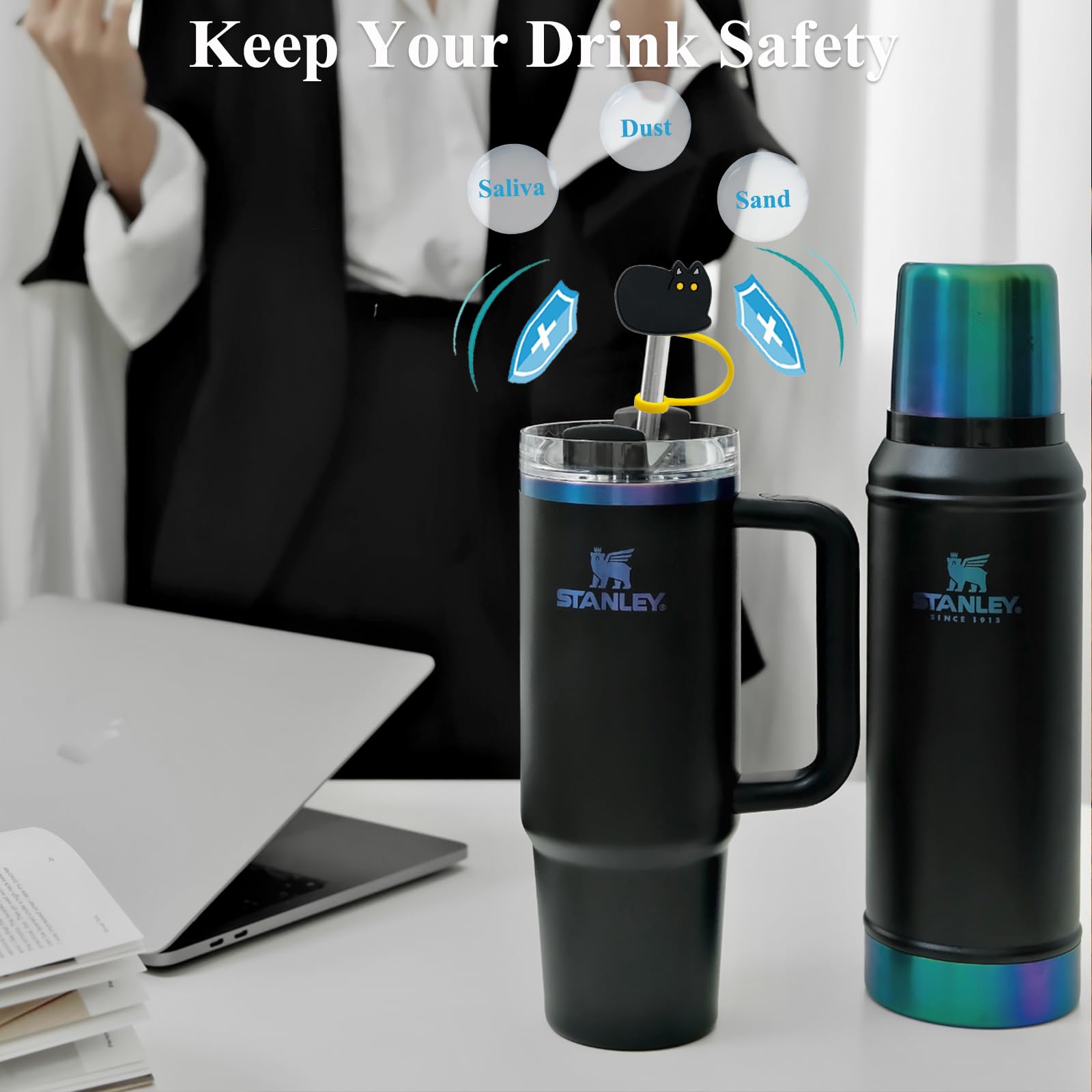 - Upgrade your tumbler game with our must-have accessory - the Amreich Black Cat Straw Toppers. Designed to fit perfectly on your Stanley cup straw cover, these silicone straw tips will enhance your drinking experience and showcase your love for cats in style.