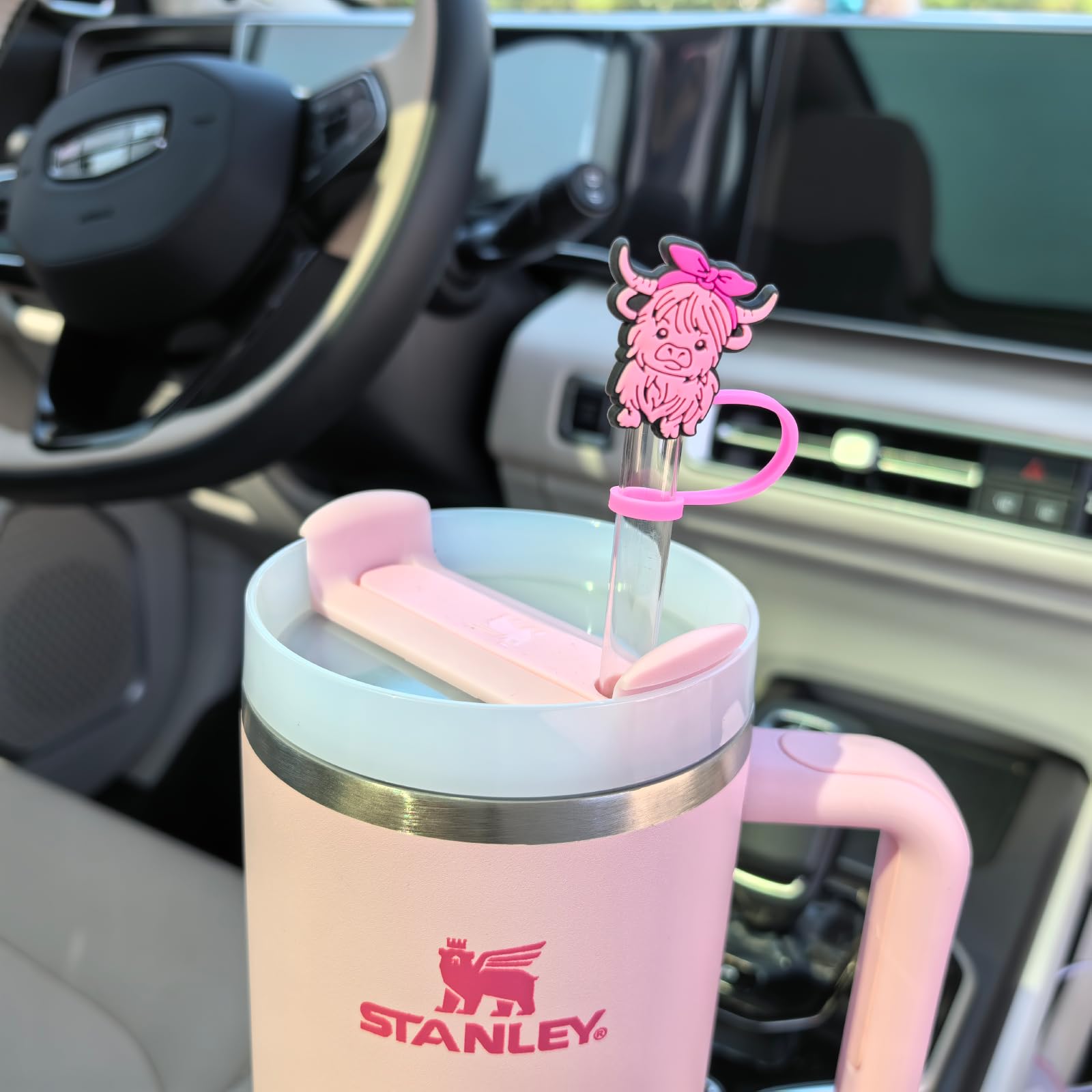 Amreich Straw Toppers - Pink Highland Cow Straw Cover Silicone Tumbler Accessories for Stanley 30-40 Oz Cups 0.4in Cow Straws Covers Cap