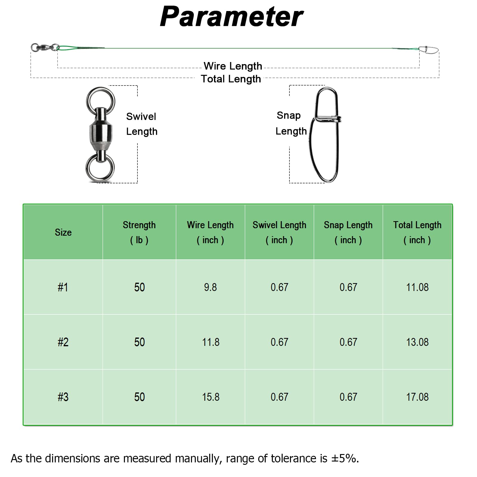 - Versatile for Both Saltwater and Freshwater: This saltwater wire leader is versatile enough to be used in various fishing scenarios, from saltwater to freshwater environments. With the ball bearing swivel on one side, its corrosion resistant properties make it a popular choice among anglers who switch between different fishing conditions. Available in 9.8in, 11.8in, 15.8in with tensile values of up to 50lb.