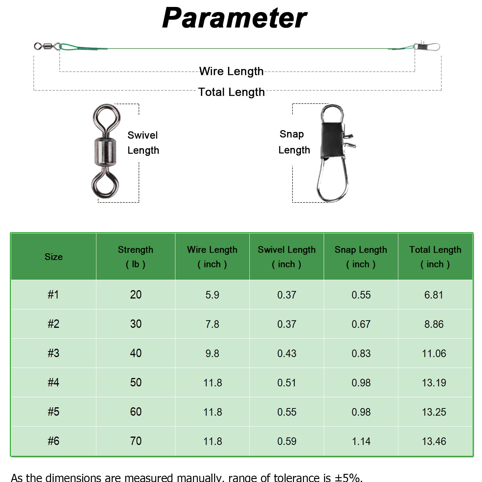 - Rugged Steel Wire Leader Lures : Stainless steel steel leaders fishing rigs are available in 5.9inch, 7.8inch, 9.8inch and 11.8inch with max size tensile values of up to 70lb to ensure durability in challenging environments and no breakage.
