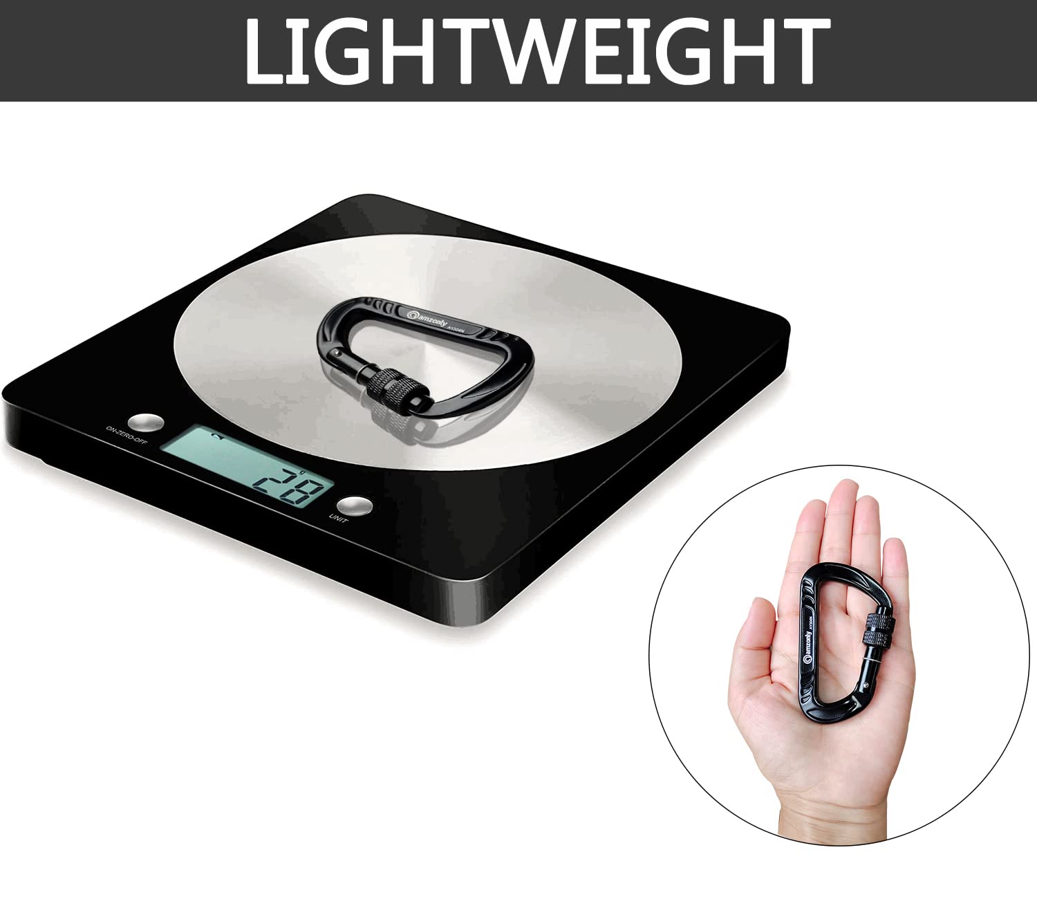 - 【ULTRA LIGHTWEIGHT】- It's only 0.8oz/28g per piece, minimizing your carry weight; It's a middle size carabiner, L: 3.19"/8.1cm, Width 1.69"/4.3cm, great size to hang keys or put in pocket; D-shaped design, wider basket to carry more things