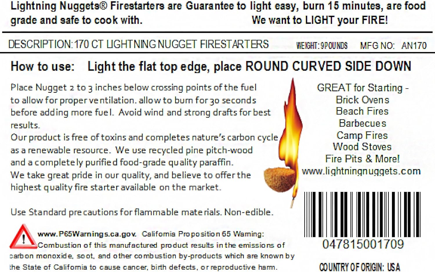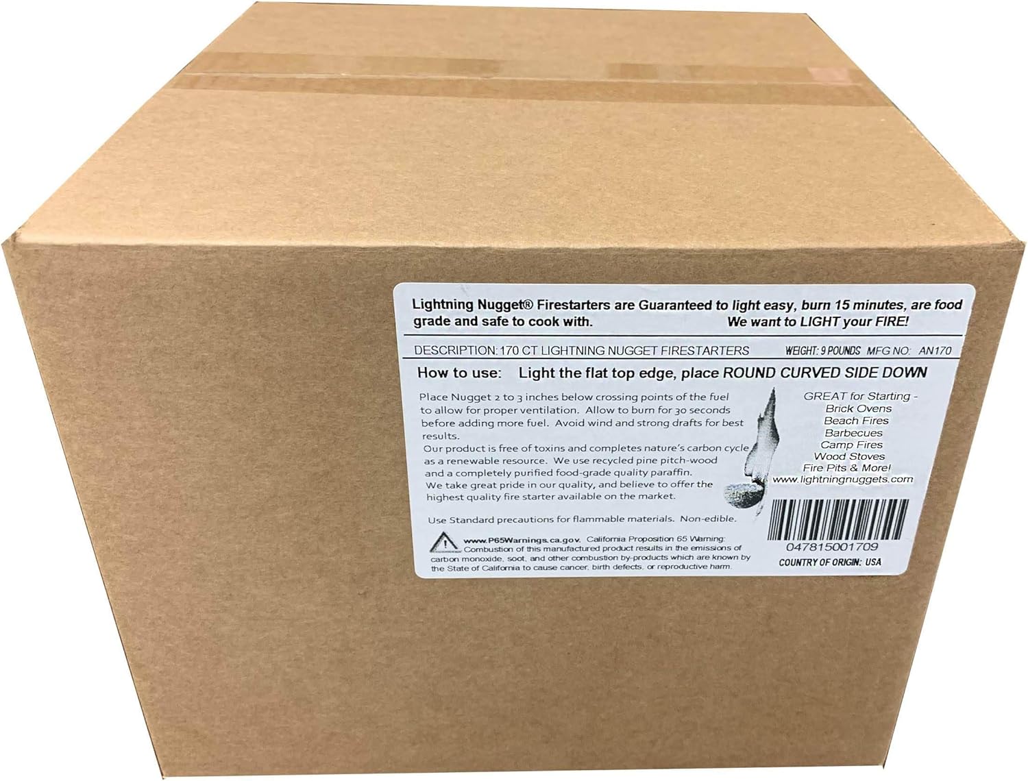 170 fire starting nuggets for quickly starting any fire indoors or out, non-toxic environmentally safe; pine scented; unlimited shelf life, made of pine wood food-grade Wax, no residue left behind, only 1 needed; no need for messy newspaper kindling, replaces the need for messy volatile lighter fluids or gels, great for ceramic cookers, pizza ovens
