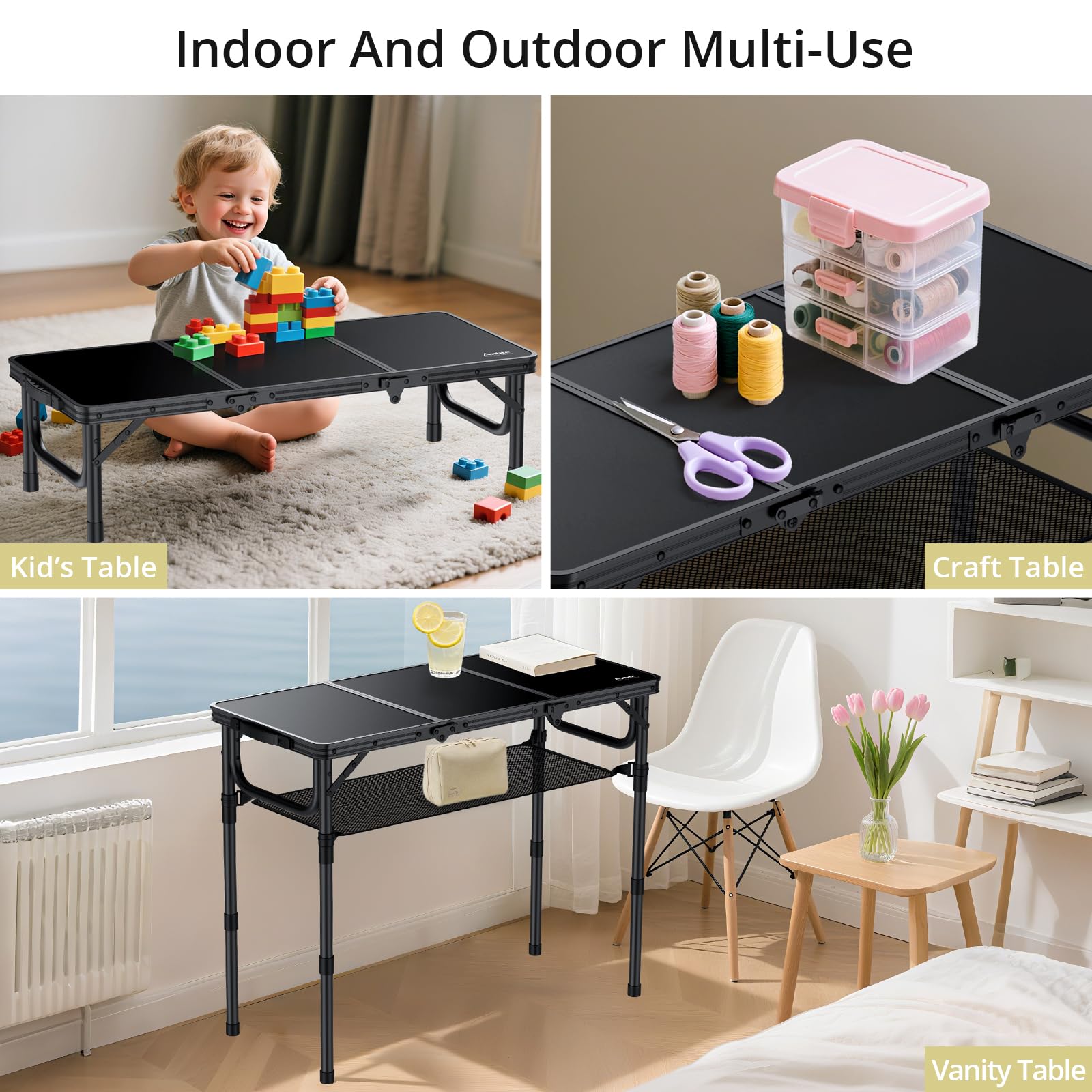 Anbte Folding Camping Table with Storage Net, 3ft Camping Table Aluminum Folding Table with 3 Adjustable Height Max 27.5 Inch Picnic Table Portable Table for Outdoor Backyard BBQ, Pure Black