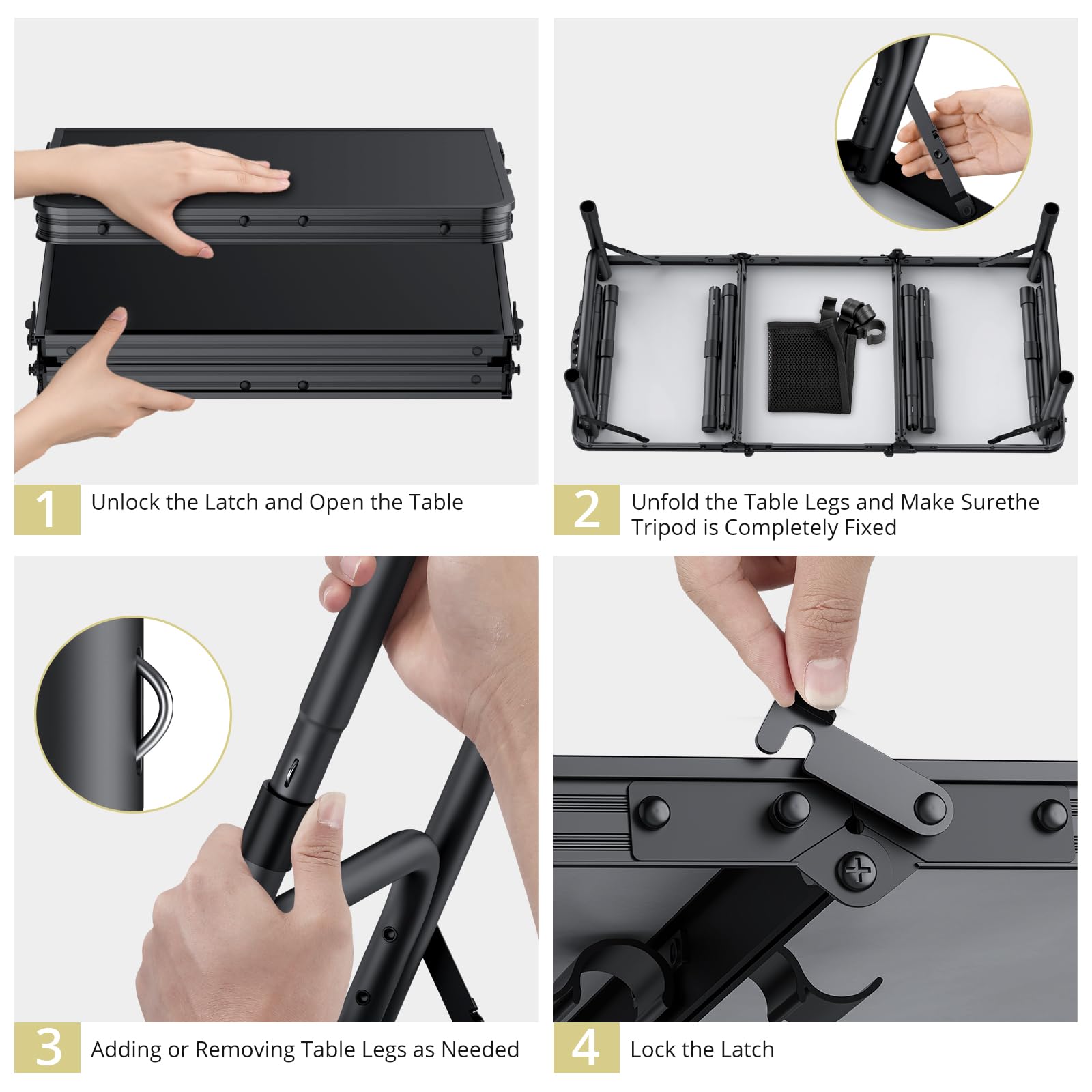 - High Quality Material, Sturdy and Durable: The entire frame of portable table is made of thicker aluminum alloy, which is very solid and durable. MDF (Medium Density Fiberboard) tabletop is smooth and easy to clean. You can easily remove stains by simply wiping with a damp paper towel