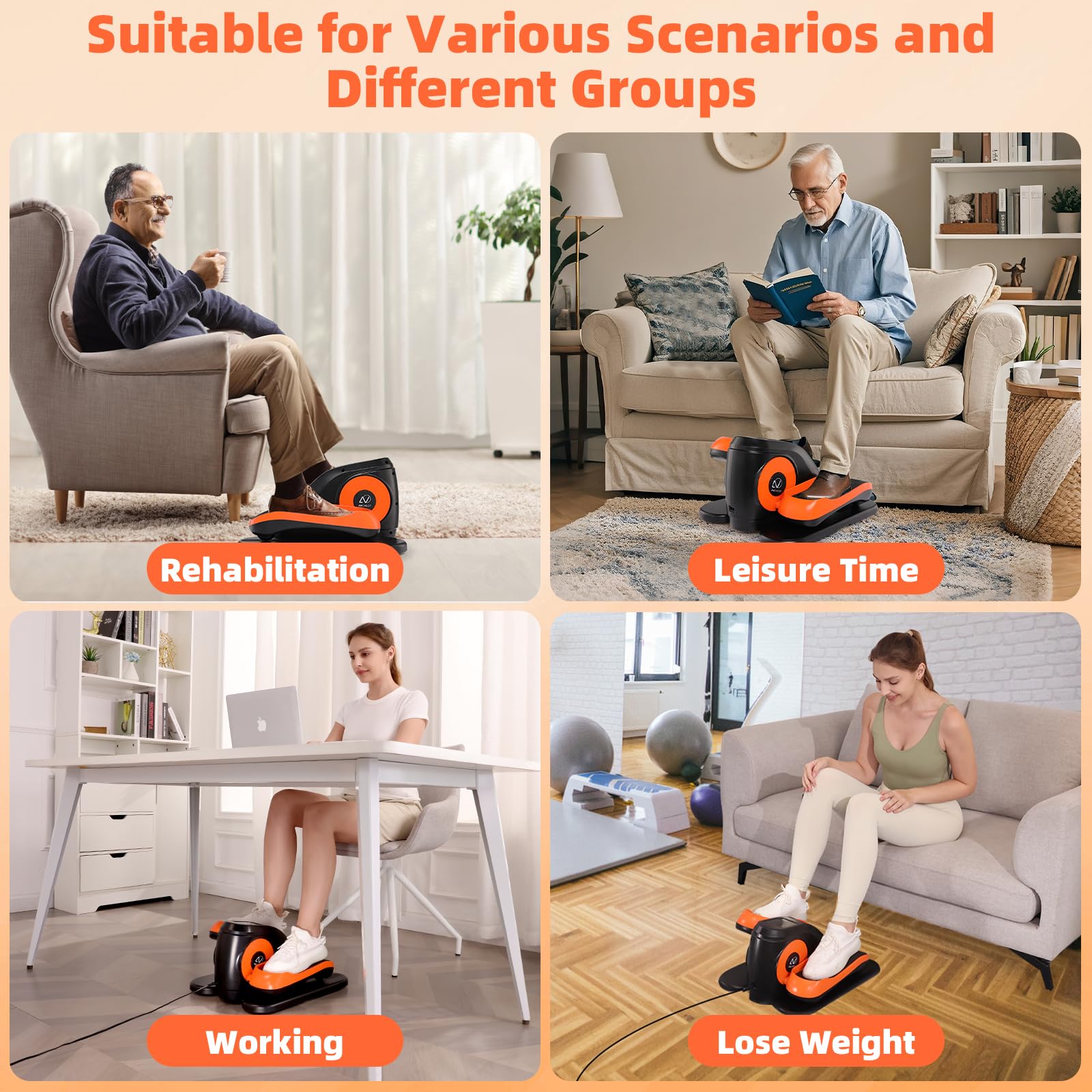 - 【Low Impact and Zero Pressure】ANCHEER under desk elliptical is ideal for seniors, rehab patients, office workers, and home fitness enthusiasts. Zero pressure design protects joints while burning calories, strengthening legs, and improving circulation. Perfect for gentle exercise and recovery.