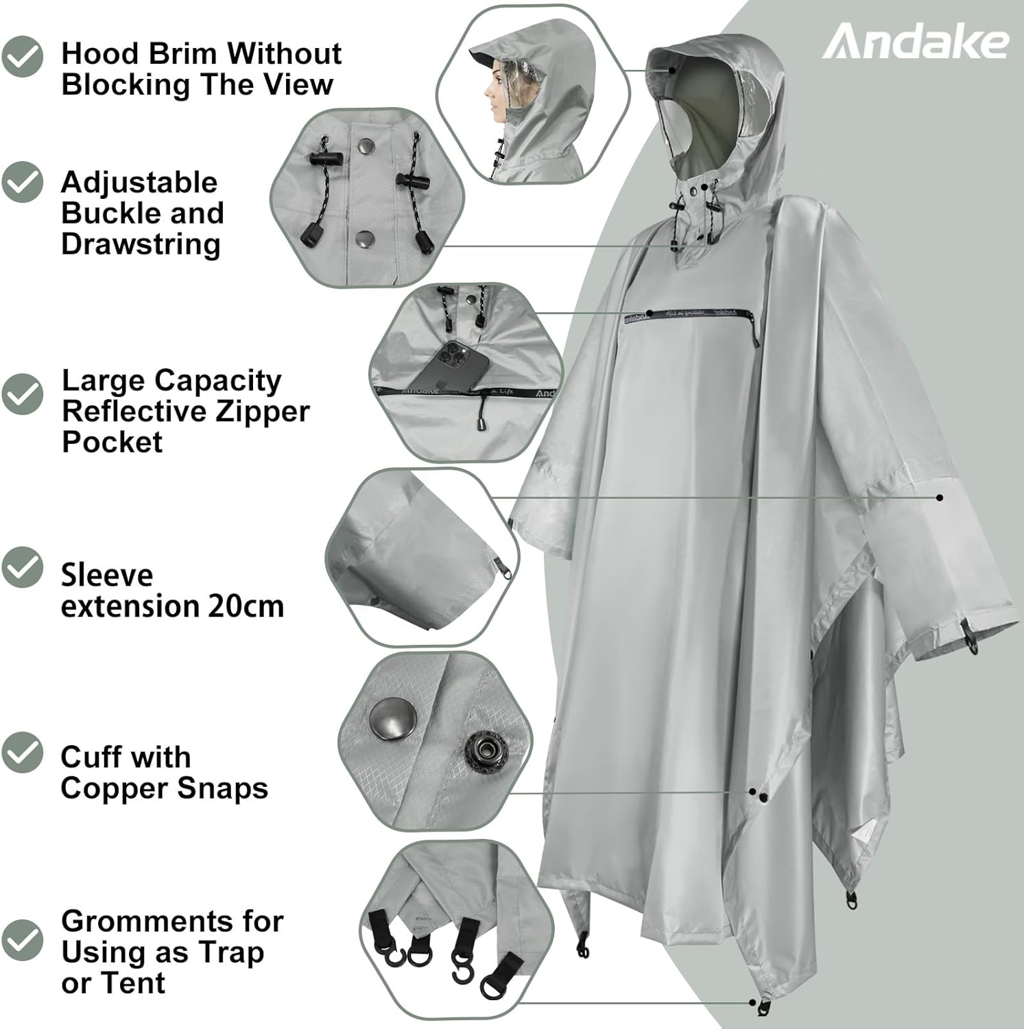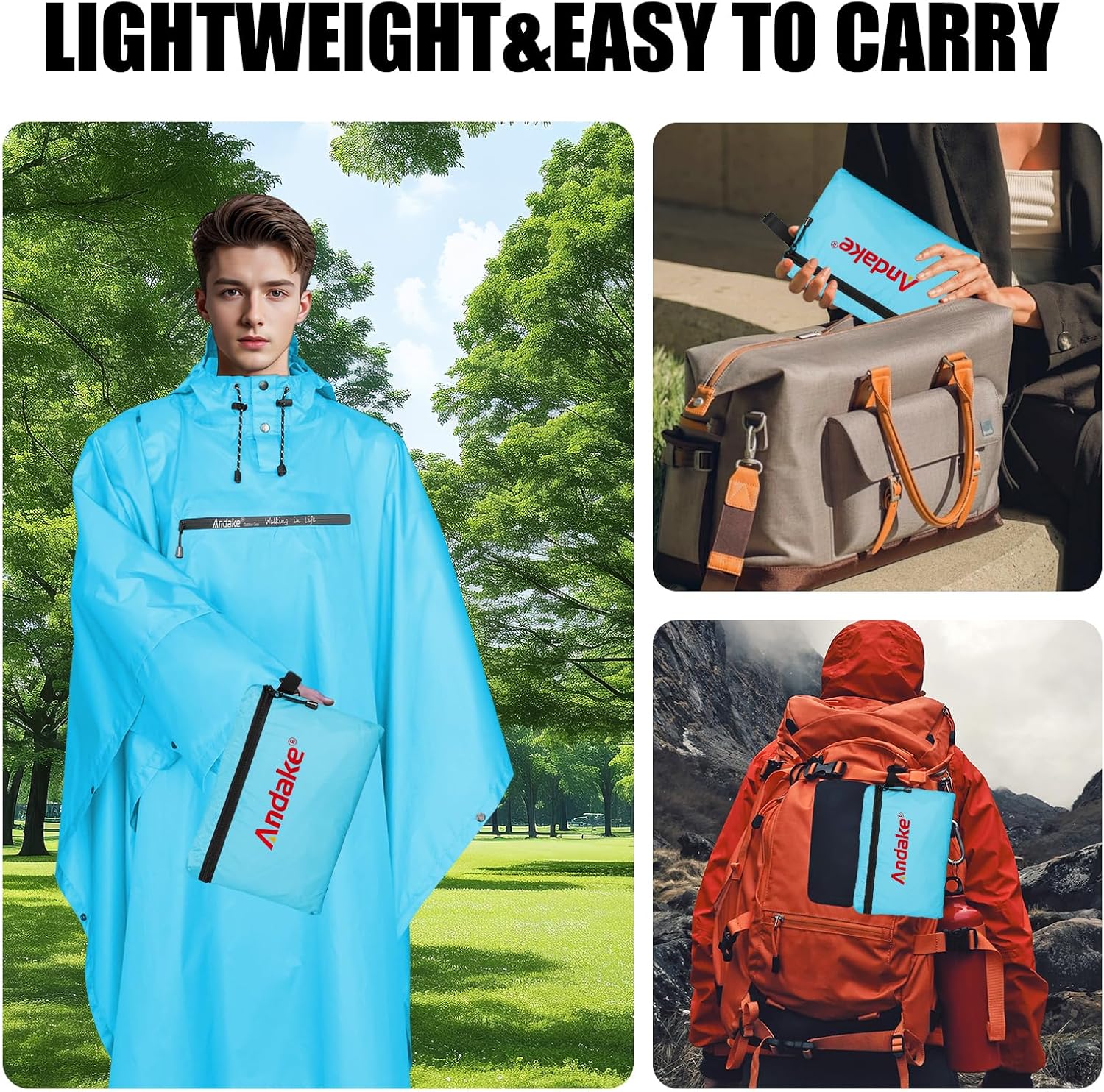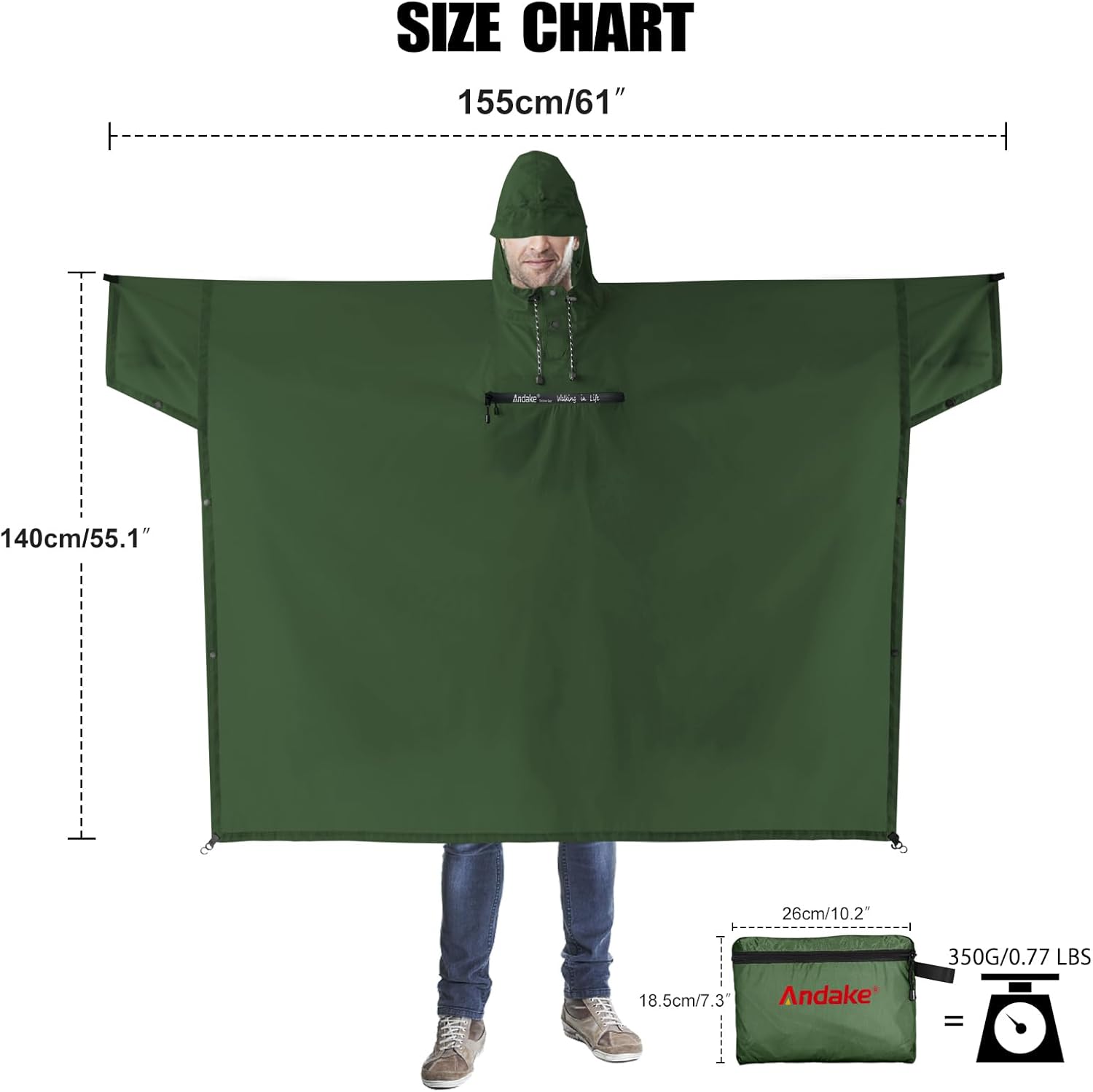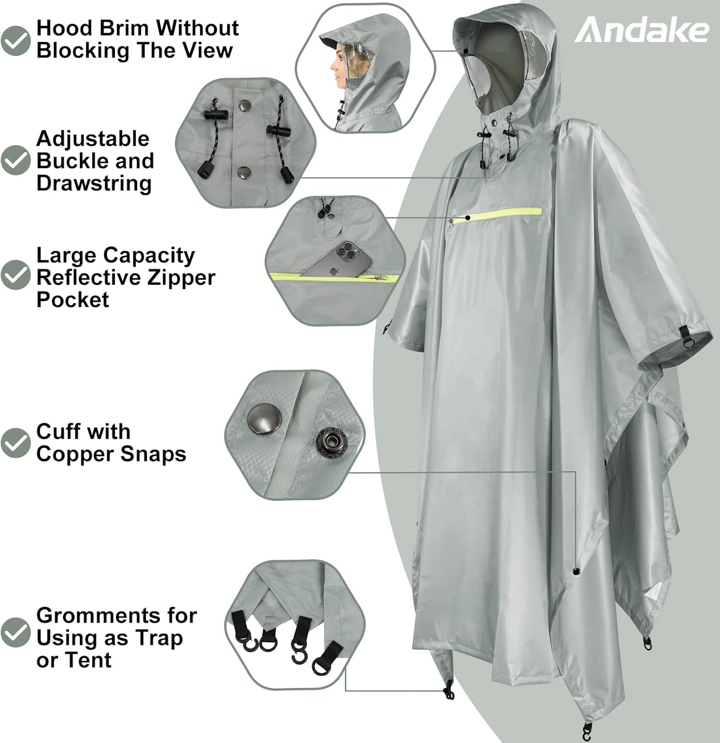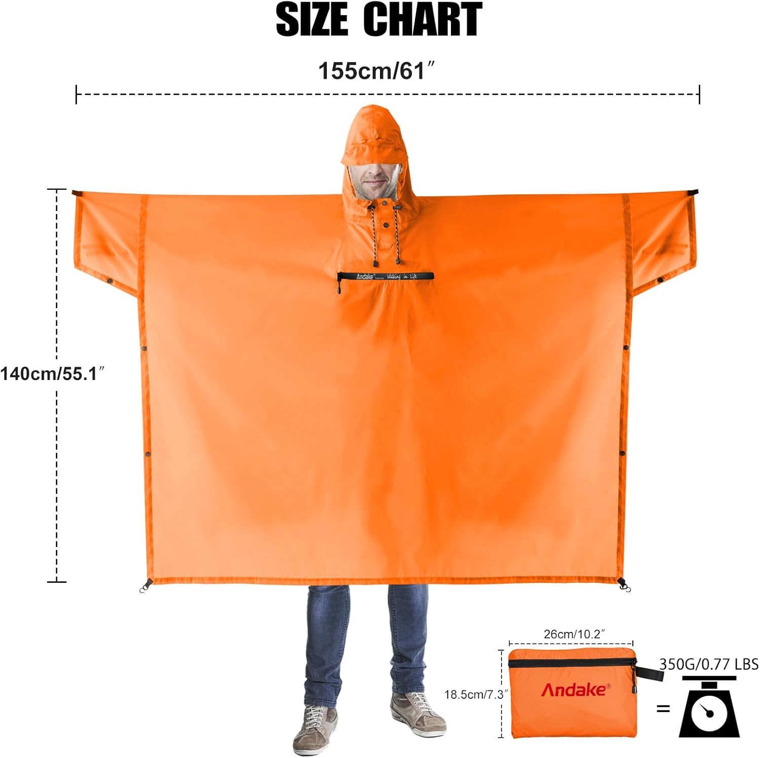 Andake Waterproof Rain Poncho for Adults Unisex,230T Ripstop Polyester,Raincoat Gear with Transparent Viewing Window Outdoors