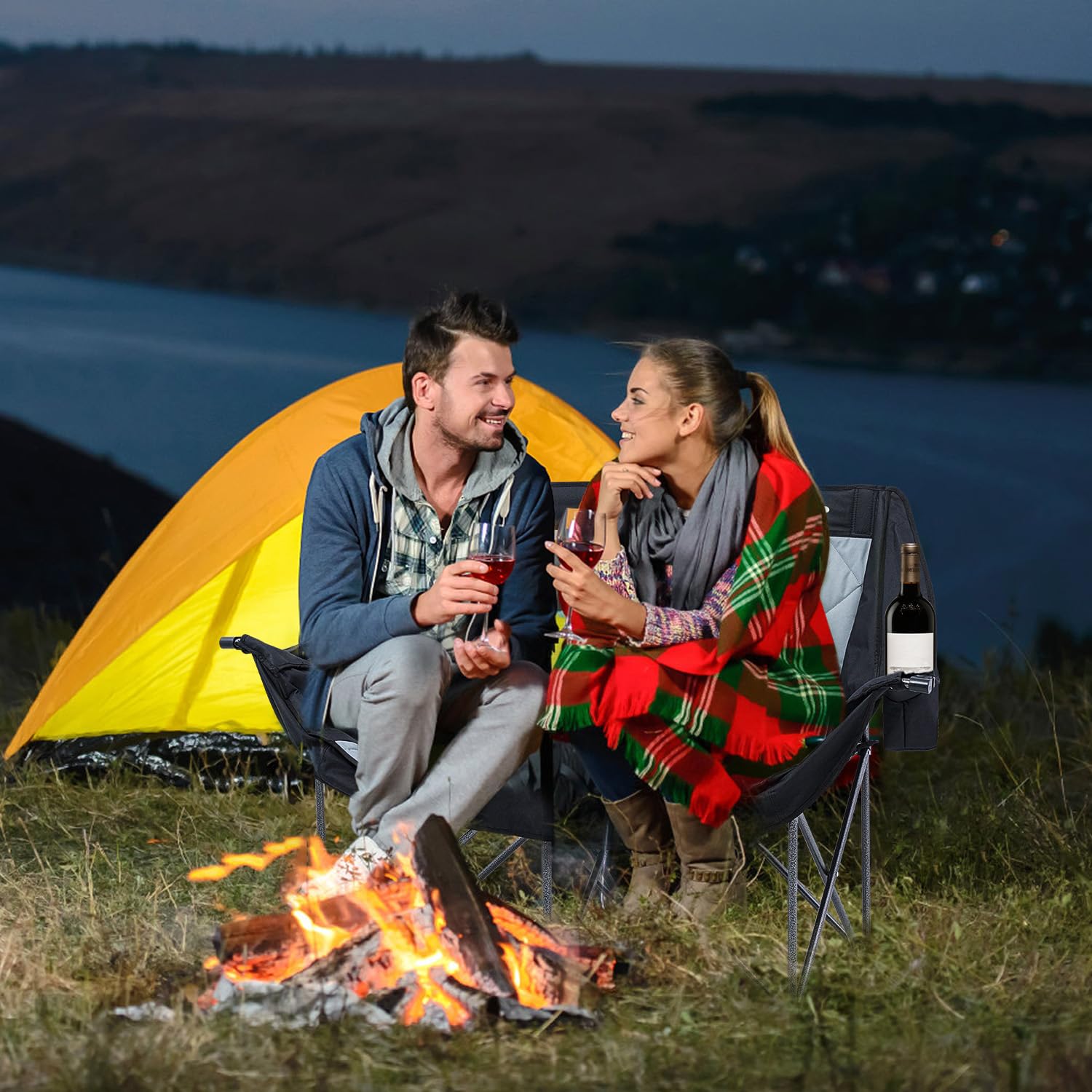 - 【Durable Construction】 Crafted from high-quality 600D ripstop polyester fabric and a robust steel frame, this Foldable Loveseat with Dual Cup Holders & Wine Glass Holders can support up to 660 lbs. It's perfect for couples seeking durability and reliability in their camping gear.