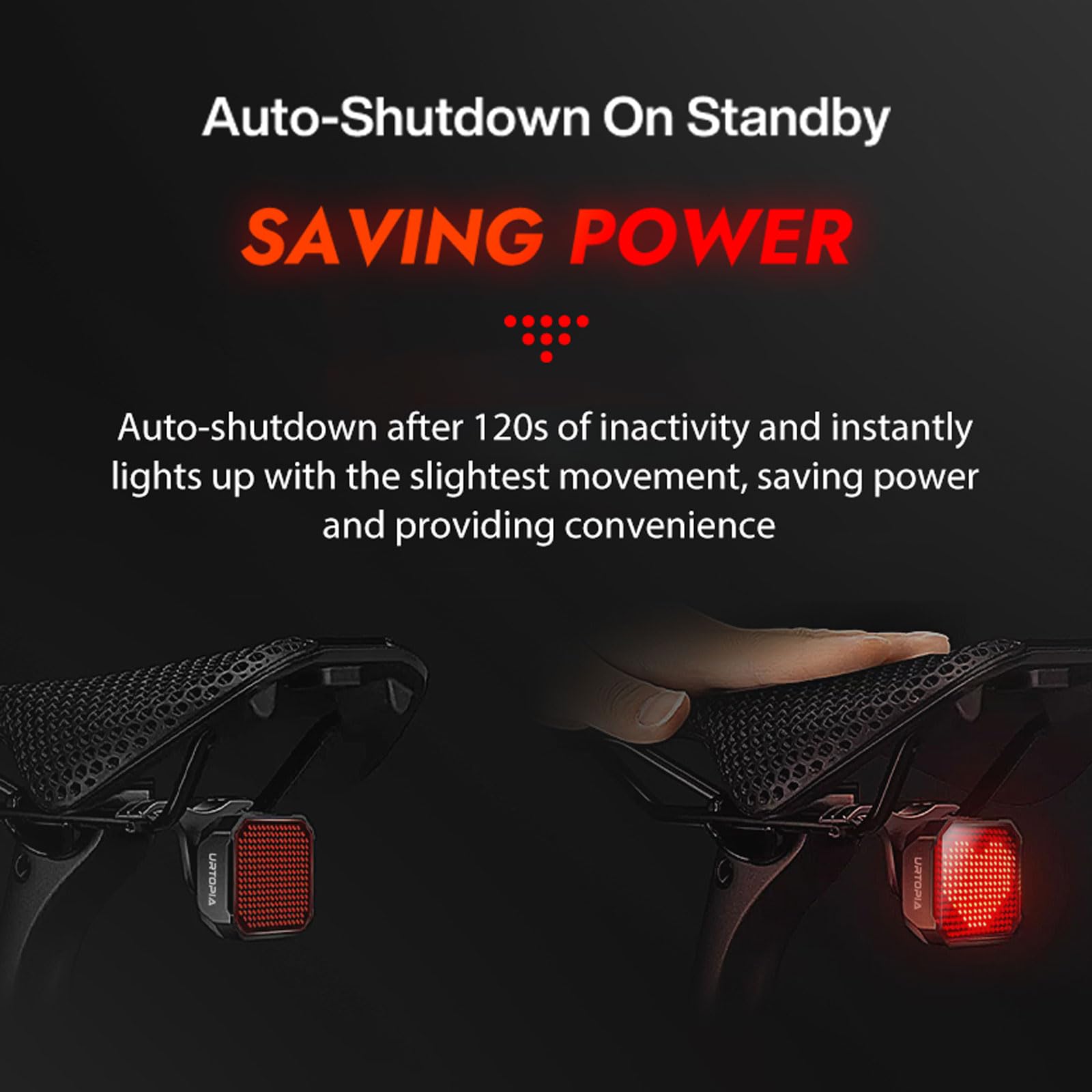 - Auto-Illuminated Brake Light for Safe Cycling: URTOPIA bike taillight features a smart sensing chip that detects brake activation, automatically illuminating a high-visibility red light to signal braking. This innovative safety feature ensures you're seen by motorists and other cyclists, providing peace of mind during every ride