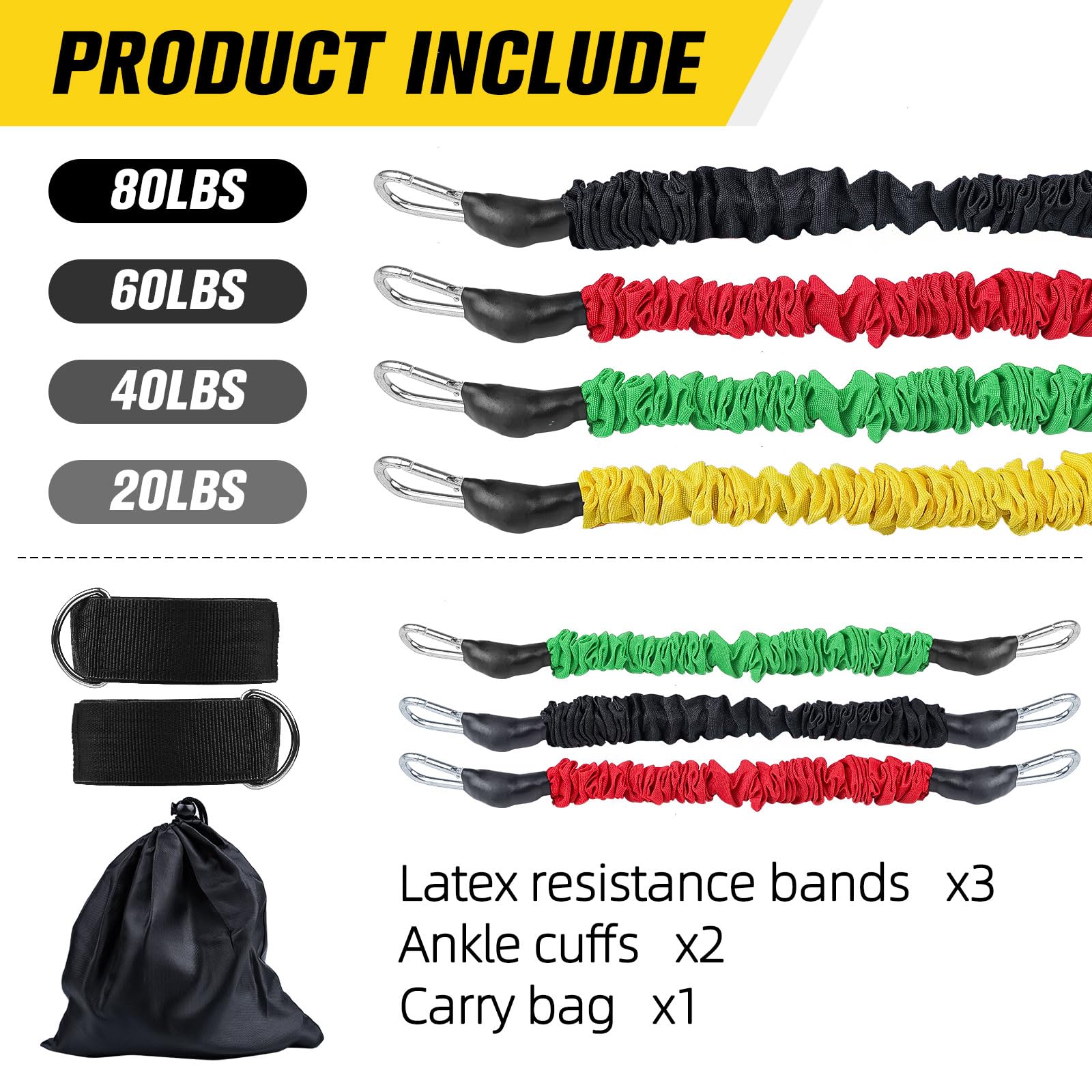 - UPGRADE YOUR FITNESS EXPERIENCE - Whether you’re new to fitness or a professional athlete, VOPOCO ankle resistance bands set gives you all-round training support! The set contains 4 resistance bands with different levels: Black (80 lbs), Green (60 lbs), Red (40 lbs) and Yellow (20 lbs) that can be used alone or stacked in combination for up to 140 lbs of resistance. Choose the right resistance intensity based on your fitness goals to get a complete workout of your legs, glutes and core!