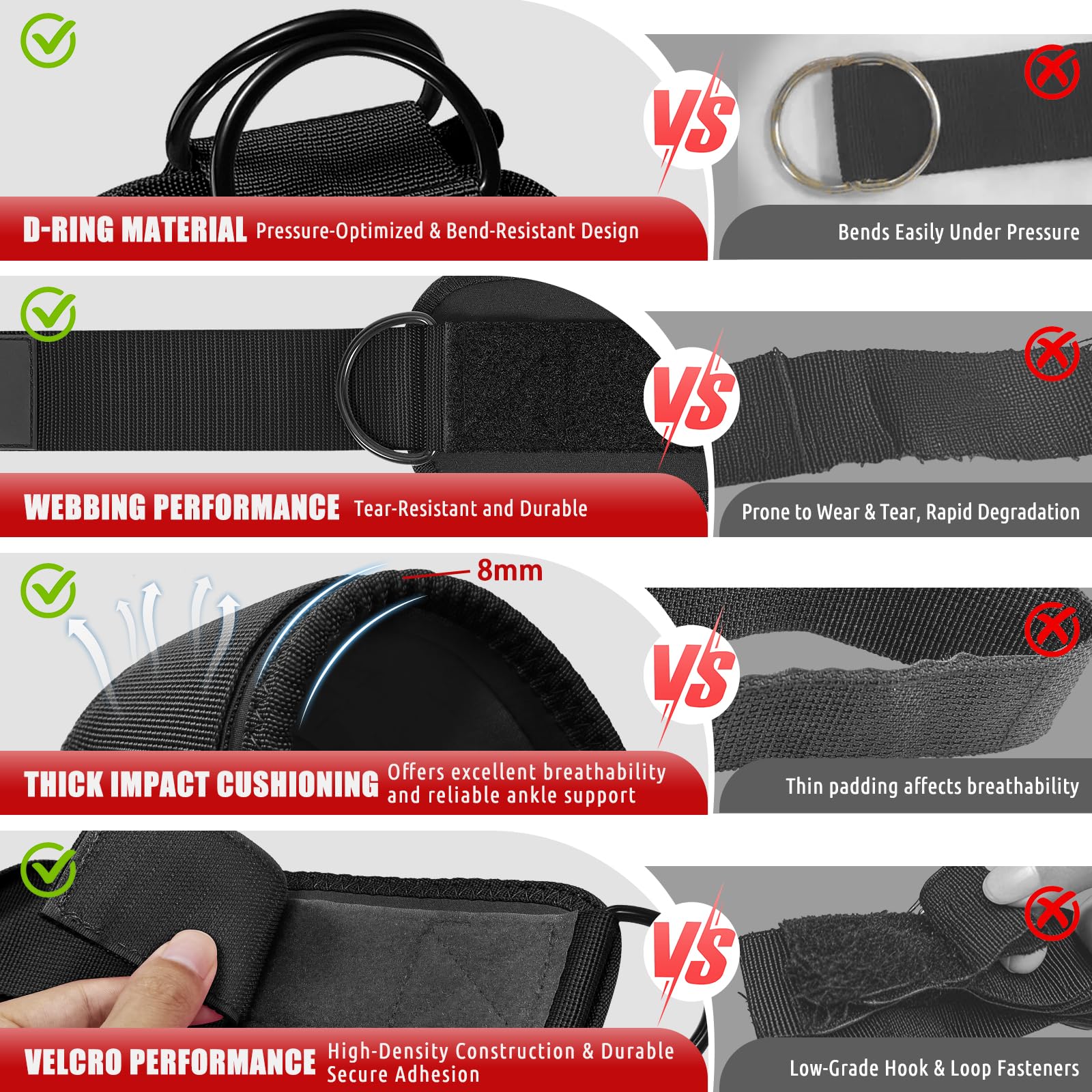 - PREMIUM COMFORT AND SUPPORT: Our ankle straps for cable machines are designed for superior comfort, featuring padded high-density sponge material for a soft, breathable, and secure fit—even during extended workouts. Neoprene ankle pads offer cushioning, while the adjustable D-ring design keeps bands secure for stable leg and glute workouts. Stay comfortable and focused on your goals.