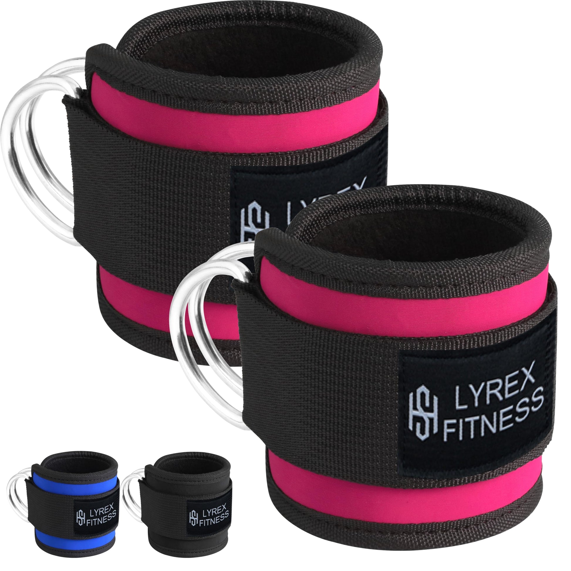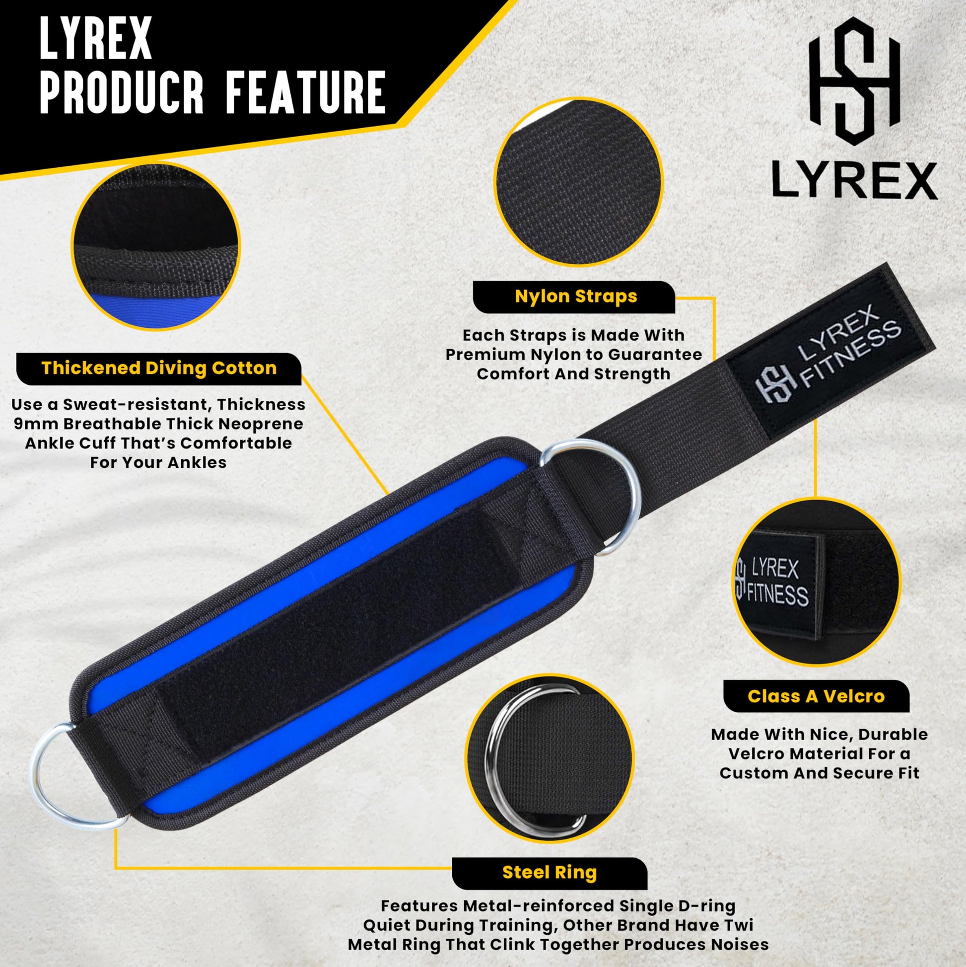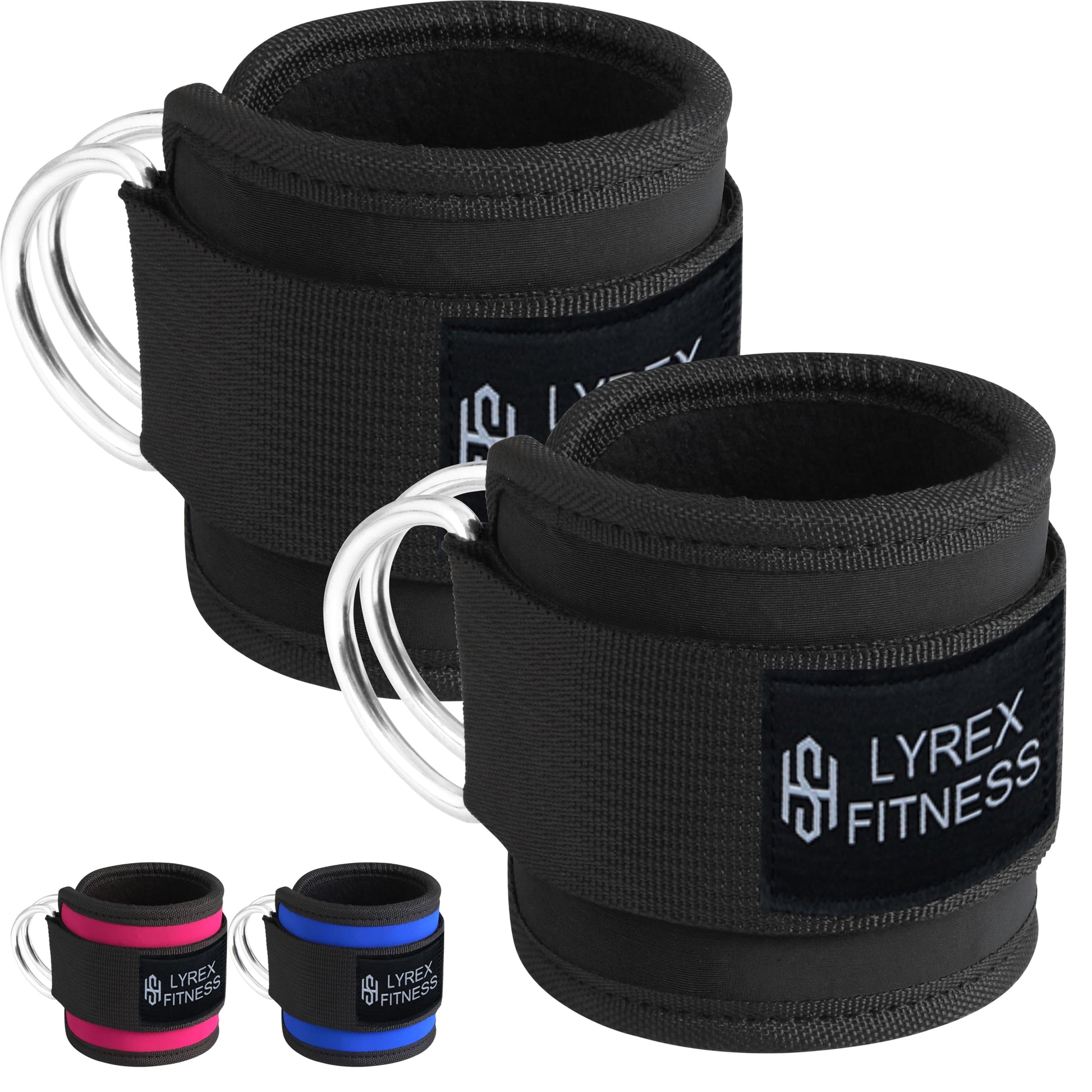 - PERFORMANCE: The LYREX Ankle Strap features thick neoprene padding, making it the most comfortable ankle cuff on the market. The 2-inch support strap is secured with heavy-duty material, making this strap extremely easy to adjust, put on, and take off. It adjusts effortlessly to fit any ankle size. Designed for beginners to intermediate level fitness enthusiasts, it provides light to medium weight support.