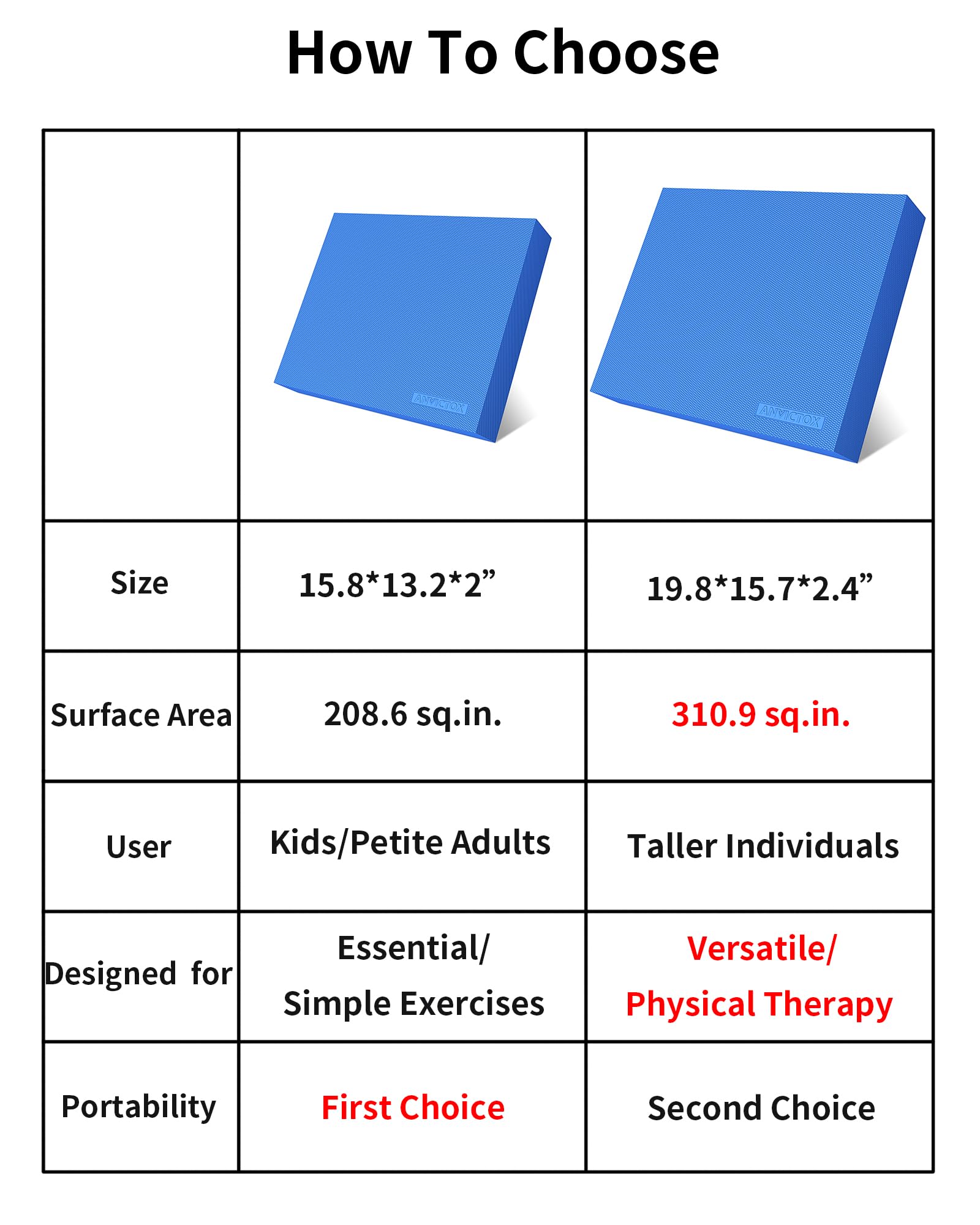 - [How to Choose]ANVICTOX balance pads are available in two sizes: the L size measures 15.8" × 13.2" × 2" (L×W×H), while the XL size measures 19.8" × 15.7" × 2.4" (L×W×H), with the XL pad offering 102 sq in more surface area than the L pad. The compact L pad is portable and suitable for children or petite adults for simple exercises, chair cushions, or daily use; conversely, the XL pad’s larger surface area accommodates taller adults, versatile training needs, and rehabilitation therapy. Therefore, choose based on your specific requirements or consult a physical therapist for personalized advice.