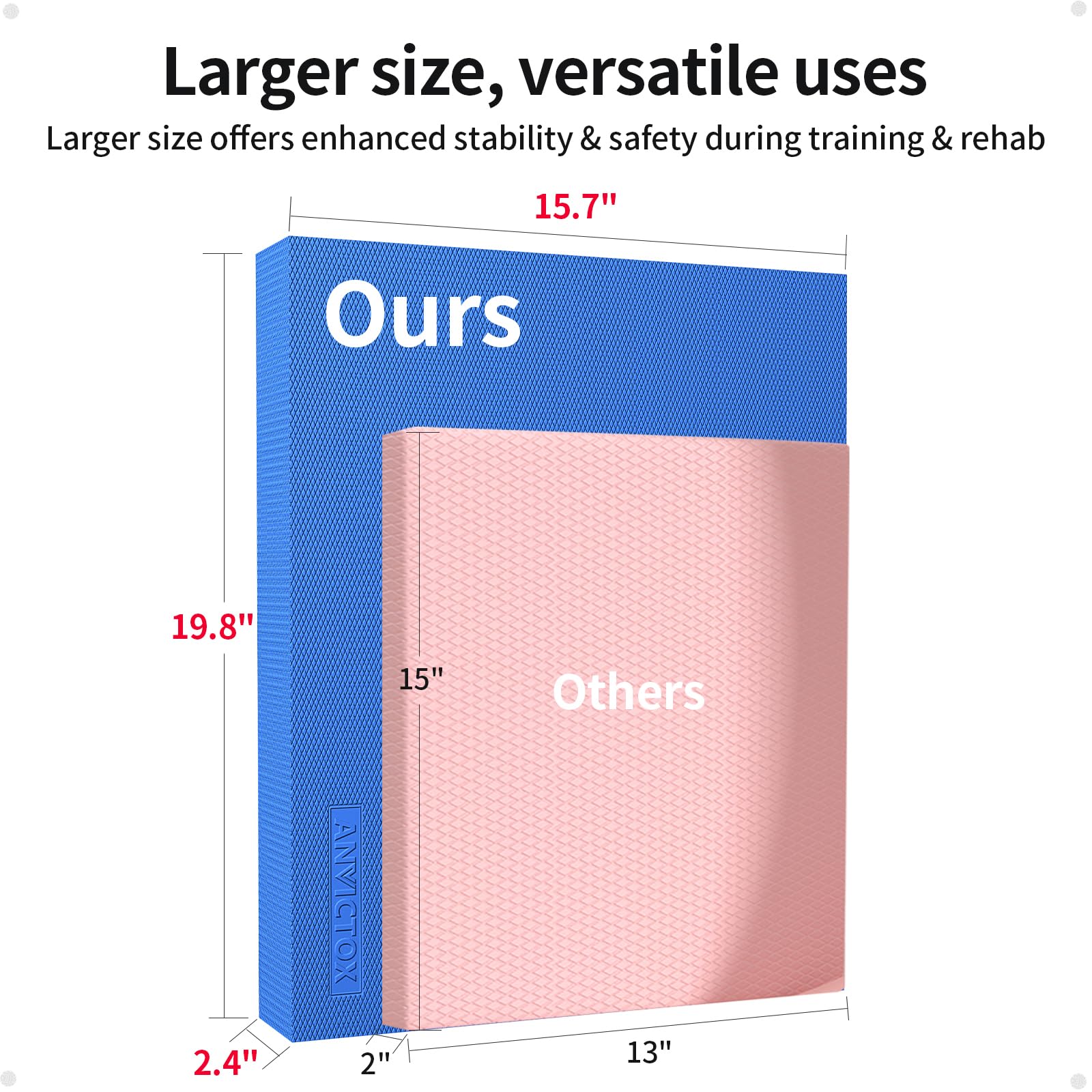 - [Extra Larger Size&Versatile Use]19.8*15.7*2.4inch.Larger balance pads provide a larger support area, making people more stable and safe during training or rehabilitation. It can also better train body muscle control and balance, enhancing body stability and coordination. Large balance pad usually has better anti-slip performance, offering better support and protection. They are suitable for users of different heights and body types, better meeting their needs