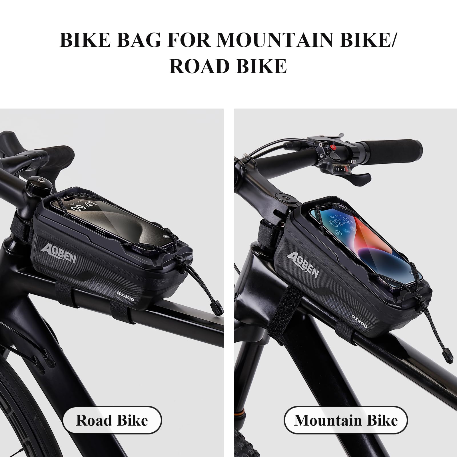 - Aoben bike phone holder bag ONLY fits for Mountain Bike (MTB) and Road Bike, NOT for electric bike or other bikes. Pls take attention to this note!