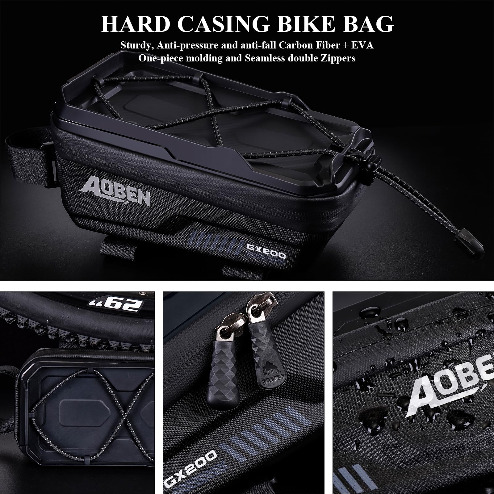 - Sealed Double Zipper & Waterproof Material - This bike top tube bag is made of ultralight and stylish Carbon Fiber and EVA hard material with seamless double zippers closure. All-in-one design with 3D die-casting process make Aoben bike phone bag hard, pressure-resistant and non-deforming. The bicycle bag is with the rain cover.