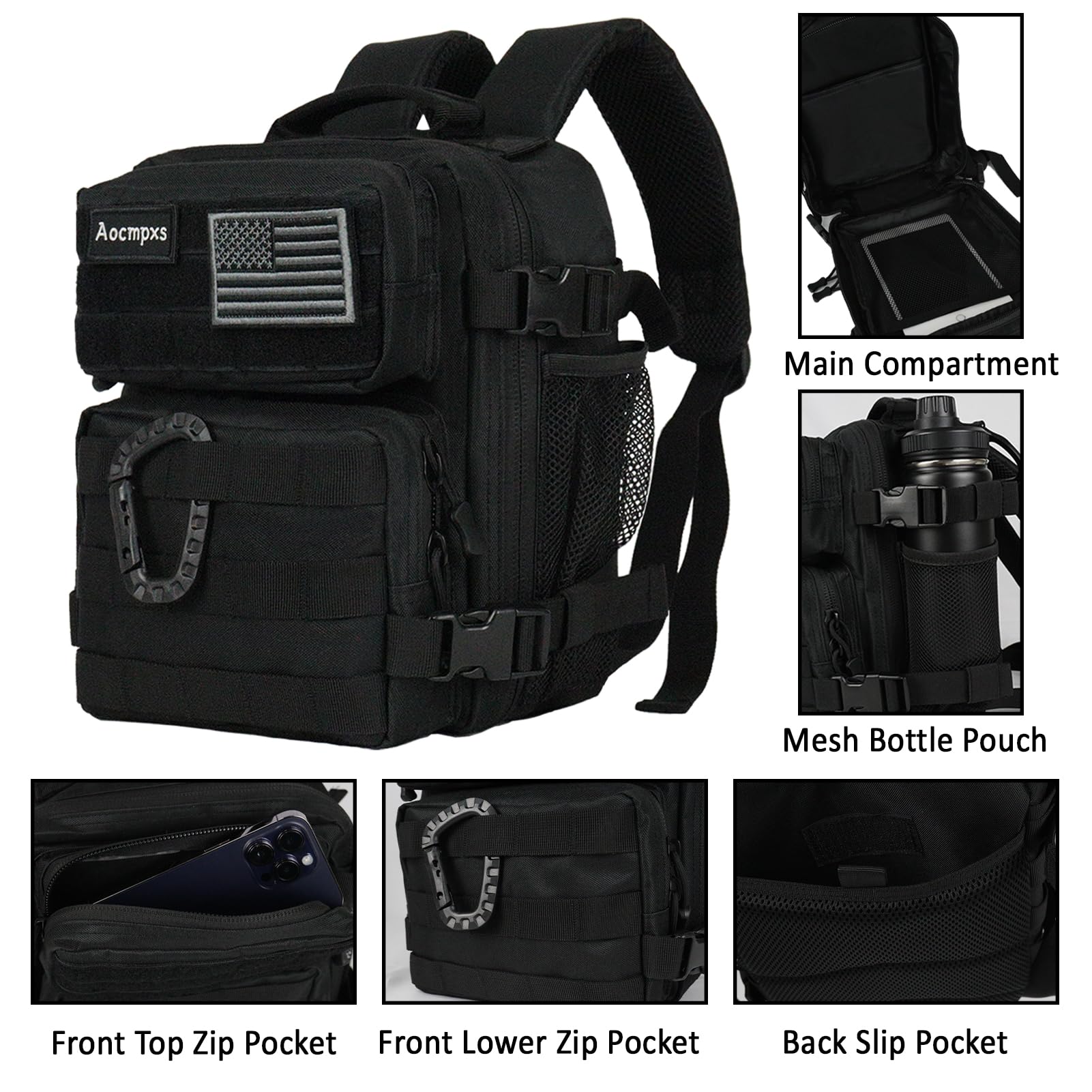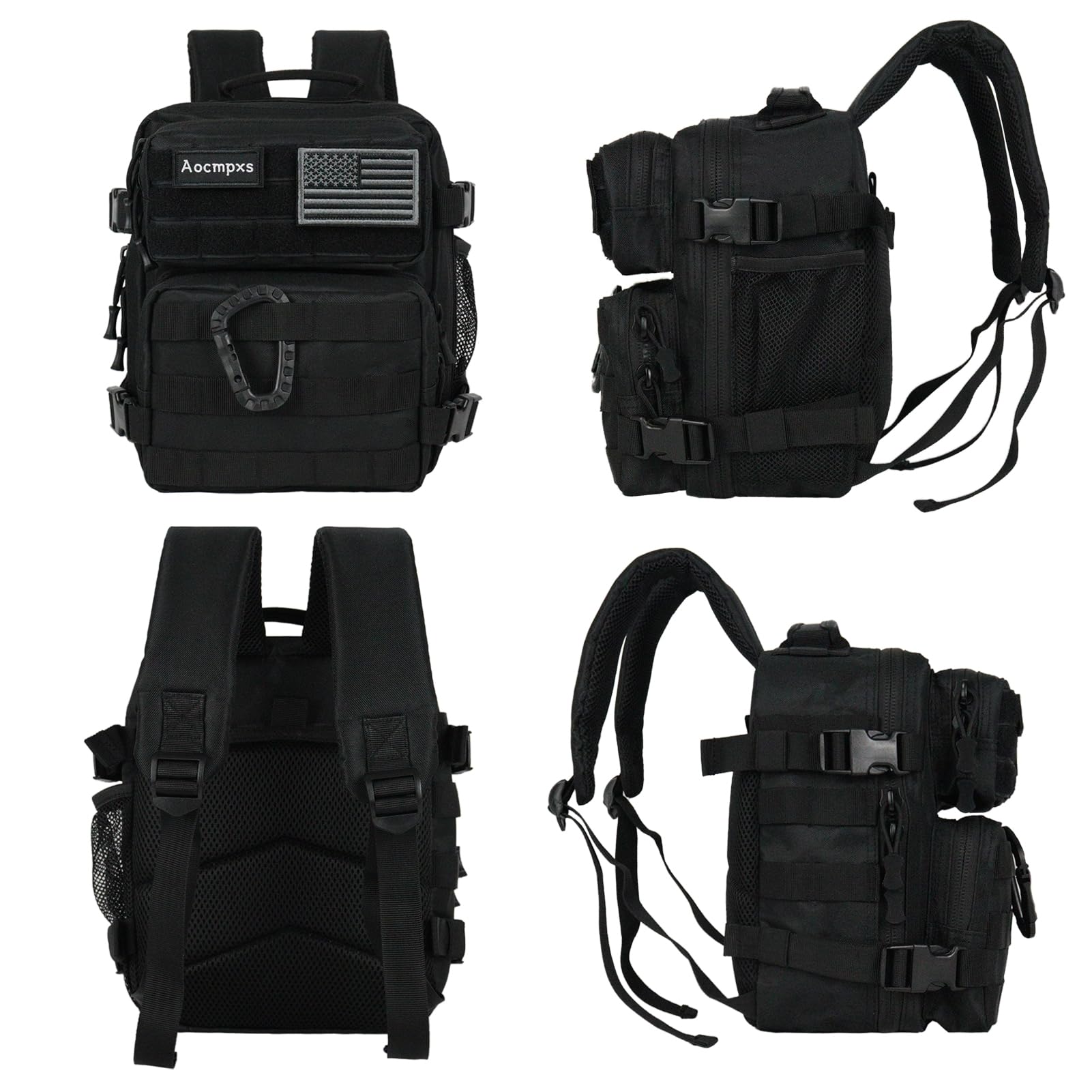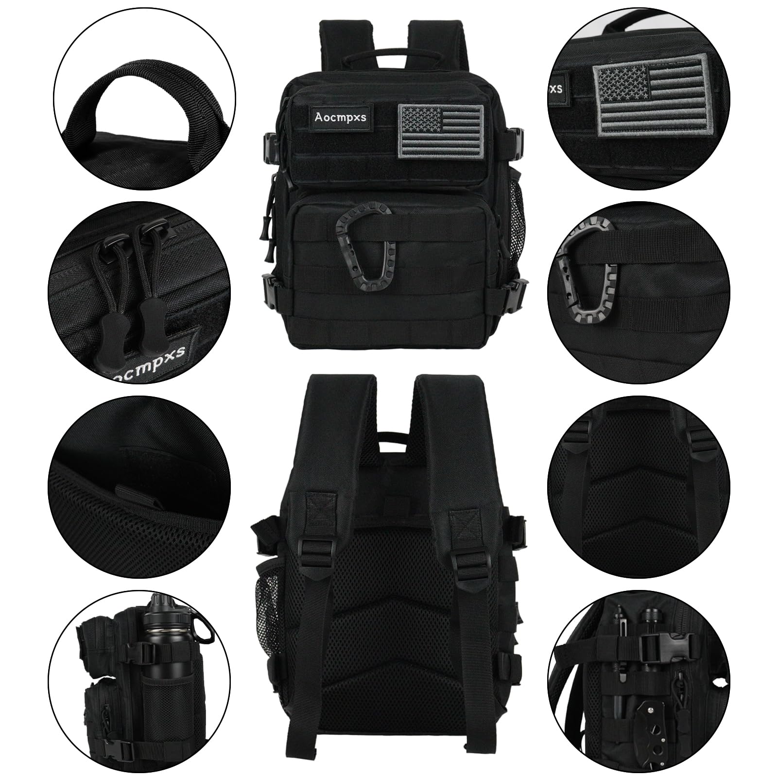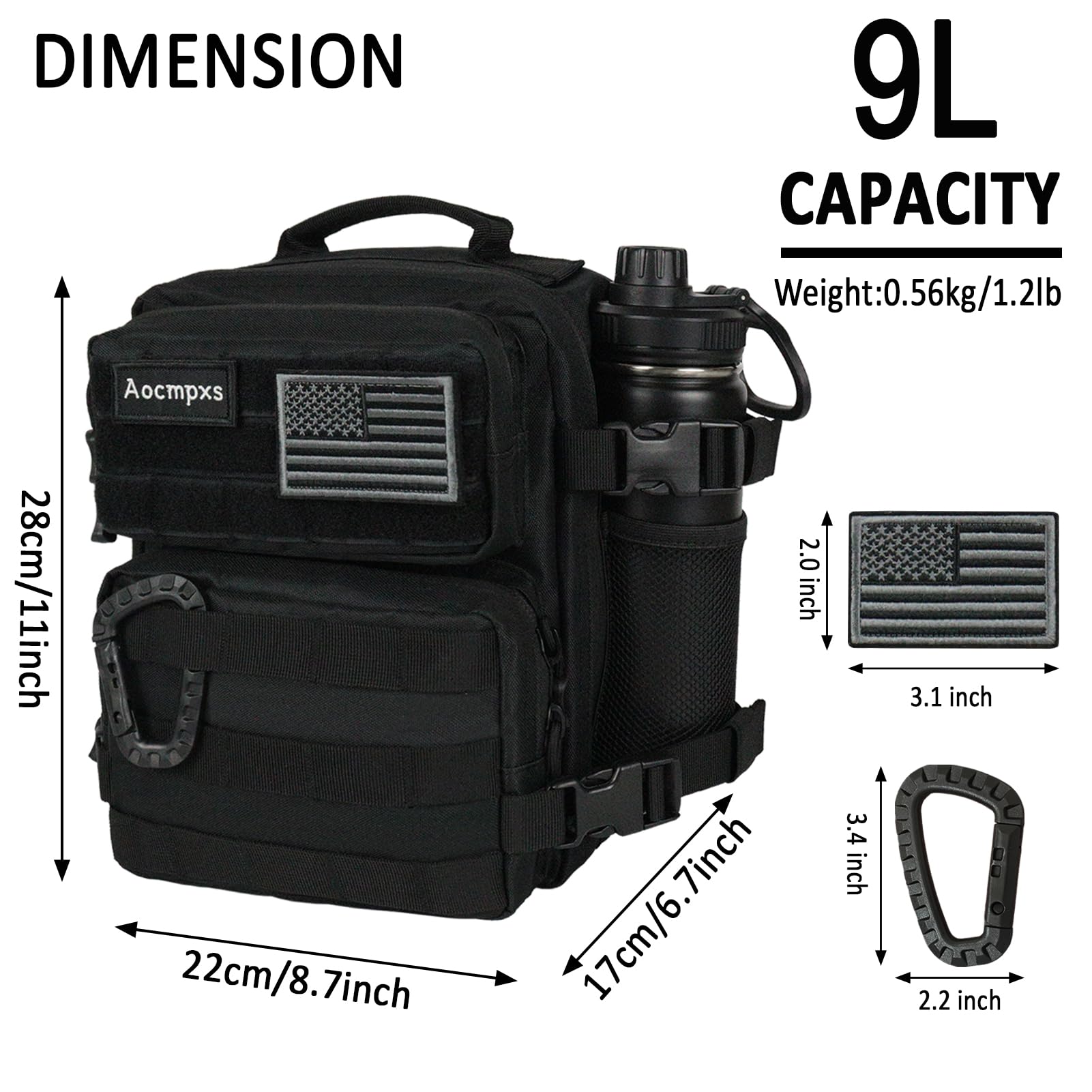 - 9L Mini Backpack: Mini Tactical Backpack size: 11"(H)x8.7"(W)x6.7"(D), capacity 9L. Including 1 main compartment fit for 7.9-inch pad, 2 front pockets and 1 bottle mesh side pockets which fit for 750ml bottle. Aocmpxs Small Backpack allows you to put almost all necessities inside. Comes with one US flag patch and carabiner.