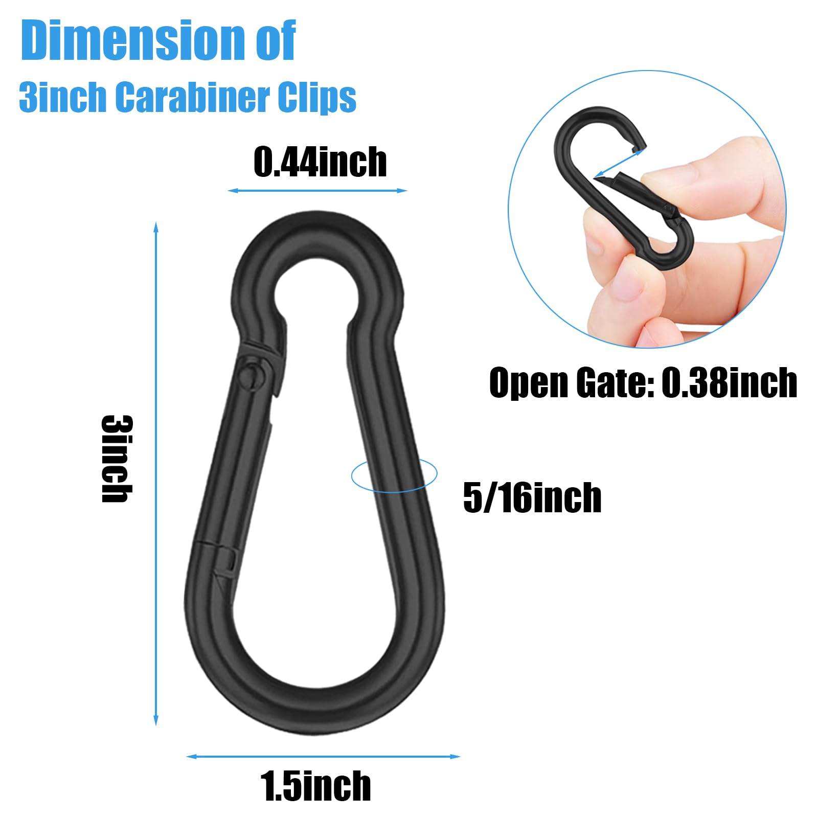 Details: 50Pack 3.2 Inch Black Carabiner Clips, Heavy Duty Snap Hooks for Swing Gym and Hammock, 5/16” Steel Carabiner Hook Spring Links Buckle for Camping Shade Sail Outdoor Camping Hiking Fitness Chain Ropes Pets- M8x80MM Large Carabiner with 460lbs Holding Capacity