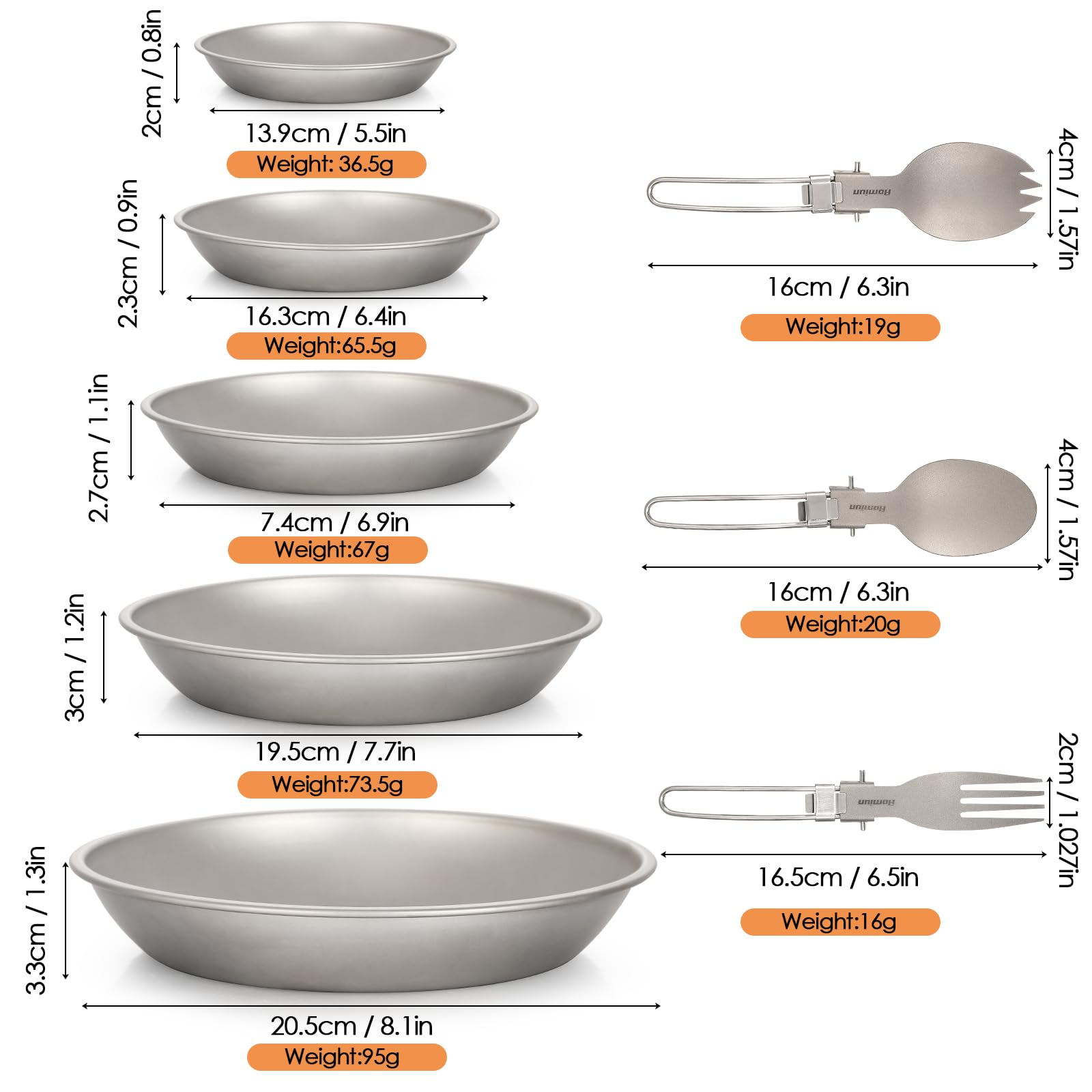 - [ Packing Including ]: This titanium dish plate cookware set features five different sizes of round titanium plates for versatile use. The plates are stackable, making them easy to pack and transport. The utensil includes a folding fork, a folding spoon, and a folding fork spoon, all made from stainless steel and titanium.