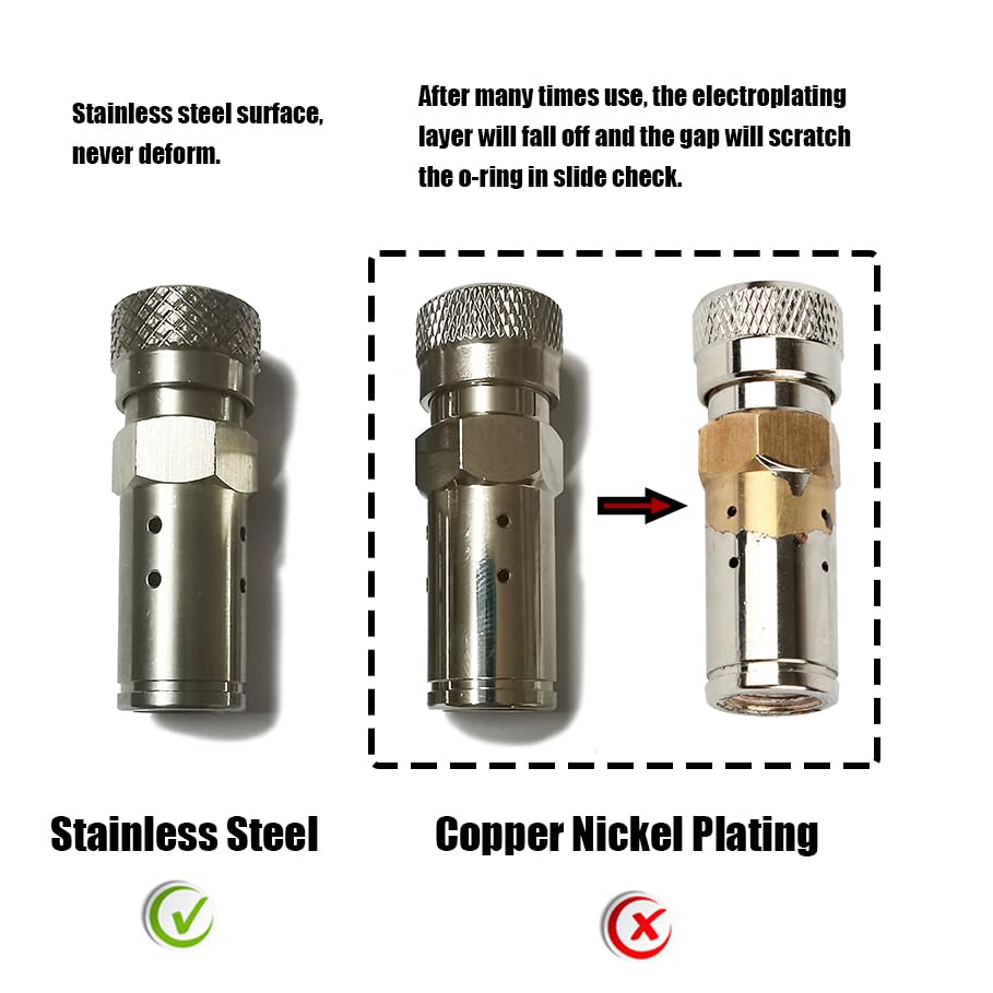 - Stainless steel quick disconnect with slide check, don't worry about the surface of copper nickel plating falling off after you sliding many times. More durable than copper and less prone to deformation.