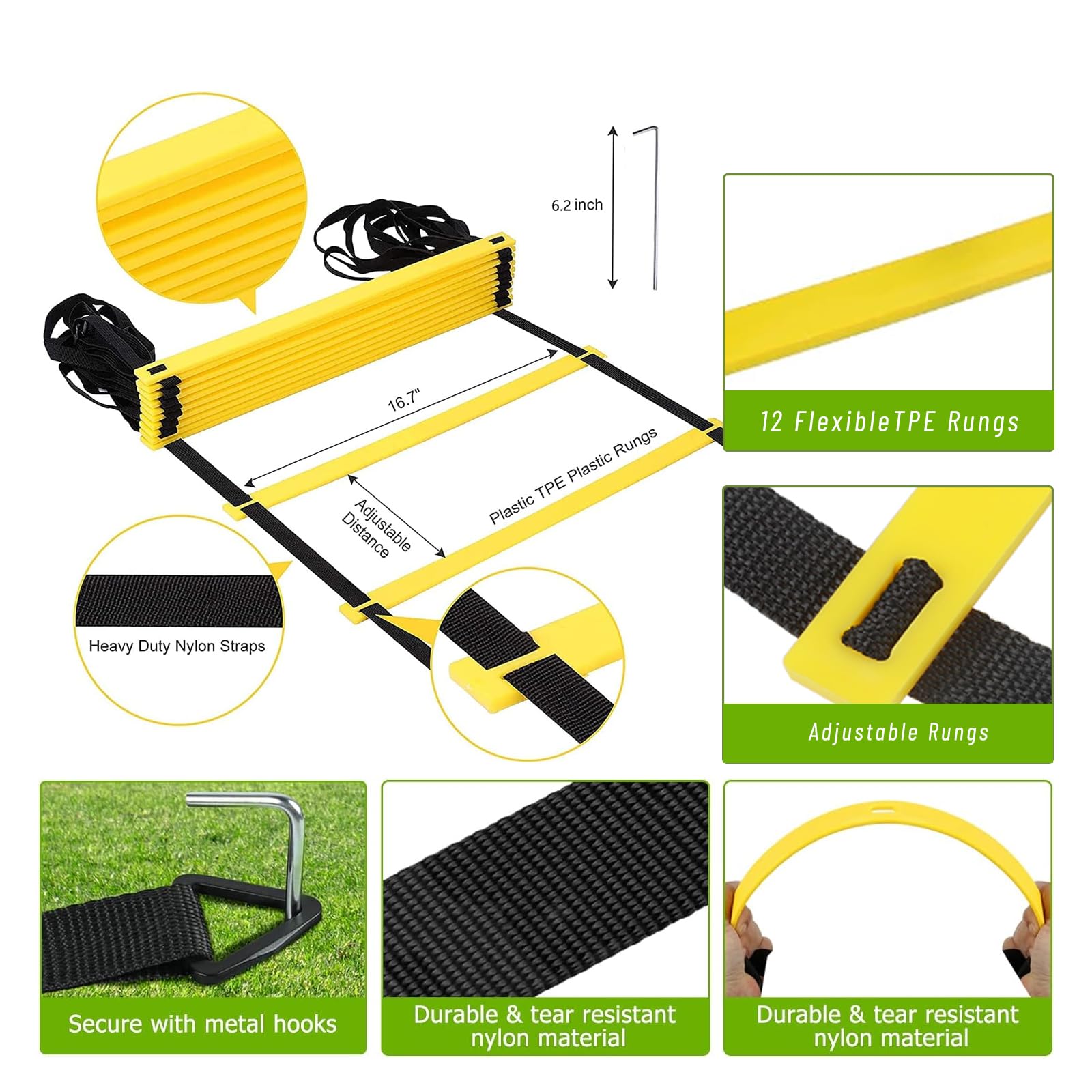 - Durable and Reliable: Our agility ladder speed training equipment is made from high-quality materials, featuring thick yellow plastic rungs, reinforced straps, and a durable design to withstand wear and tear. The kit includes a large bag and separate compartments, ensuring easy organization and saving you training time wherever and whenever you need it.