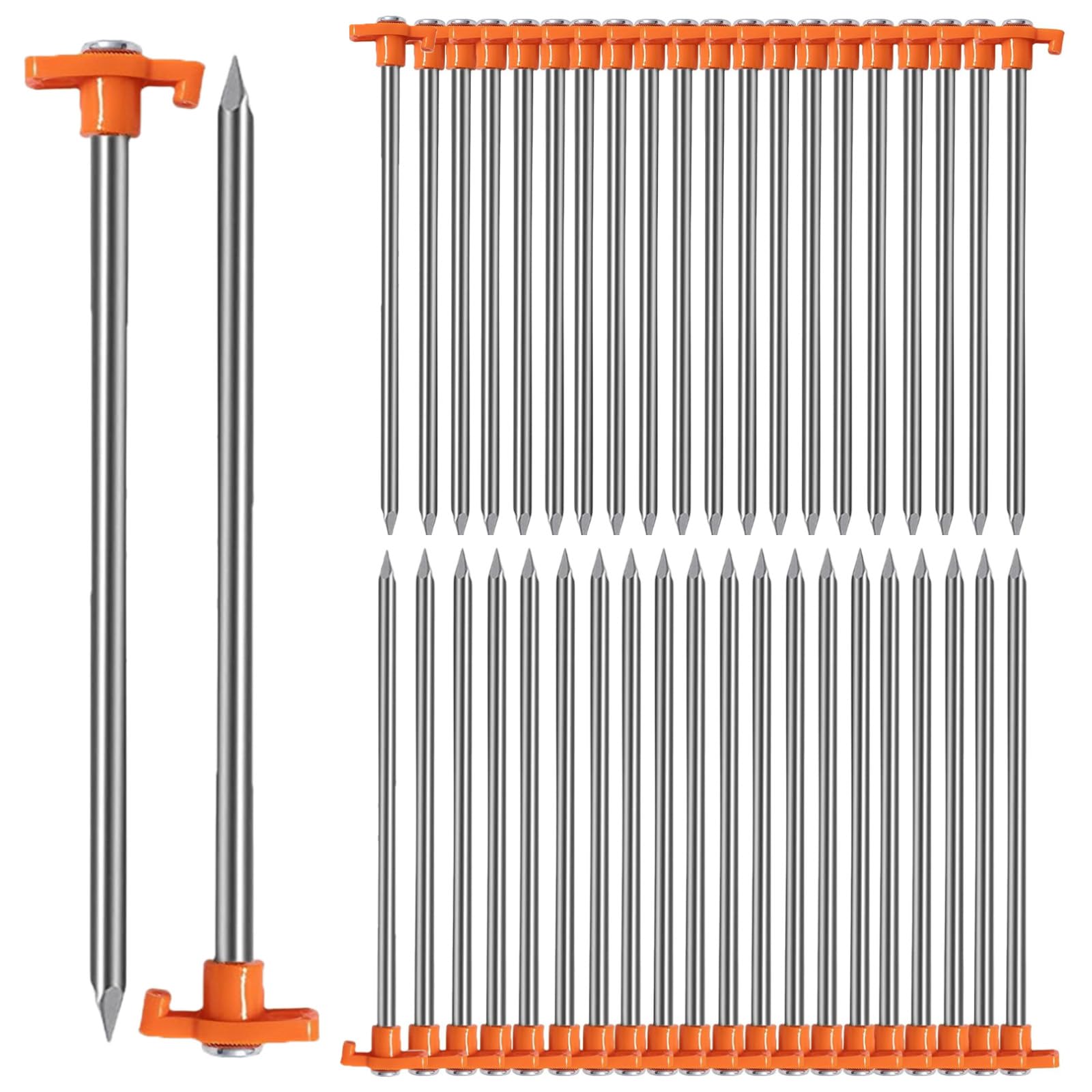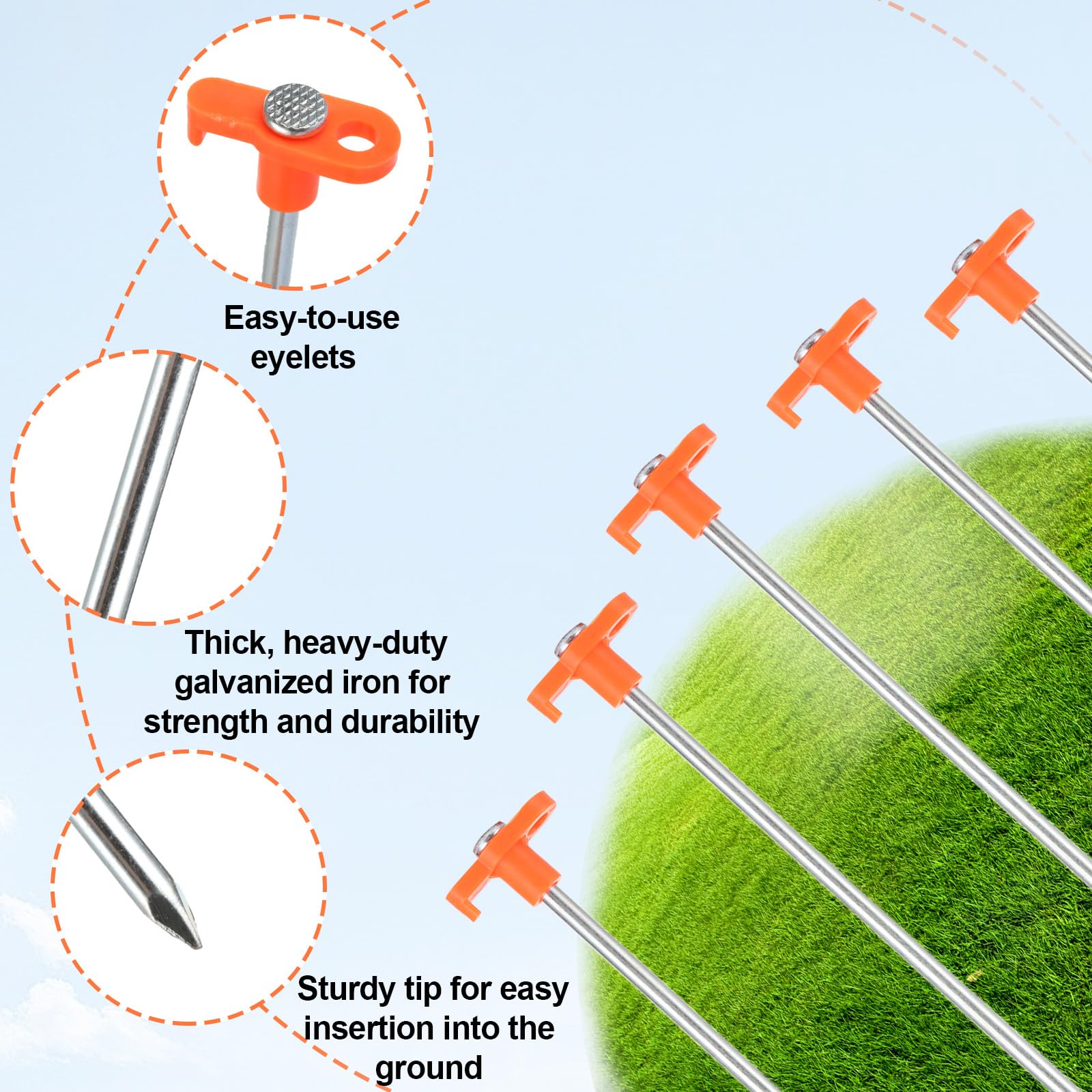 - Strong Material - Our metal tent stakes are made of high quality heavy duty galvanized iron, strong, durable and rustproof. The orange tops are made of thickened plastic material, which is not easy to break and can be used for a long time in different climates.
