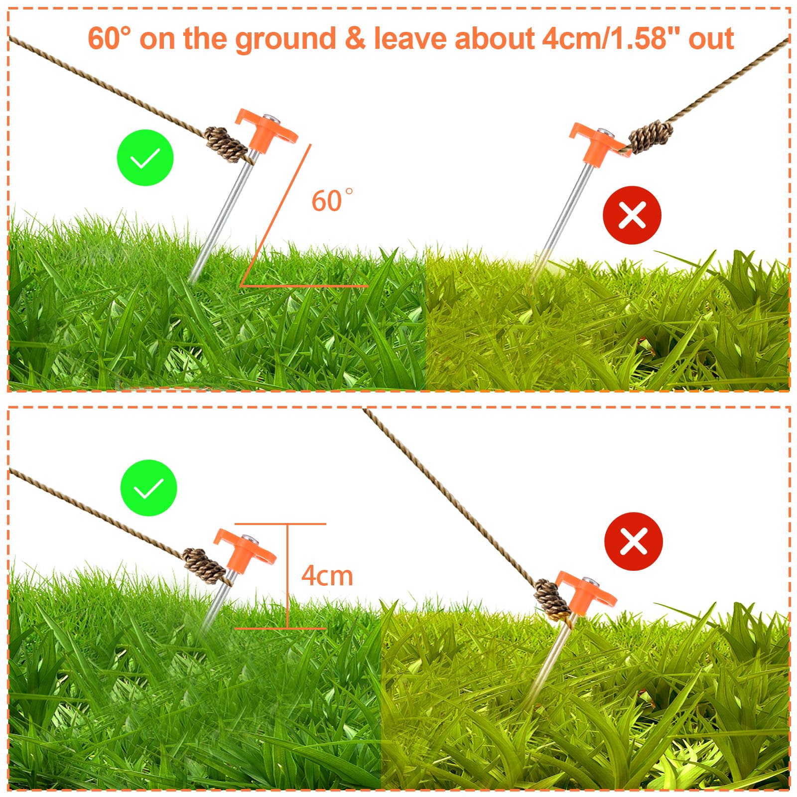 - Firmly Fixed - The ground stakes should be inserted into the ground at a 60-degree angle, not at a 90-degree angle to the ground, reinforcing firmness and resistance to strong winds. It is a professional tool for fixing tents, canopies and tarps.